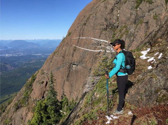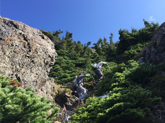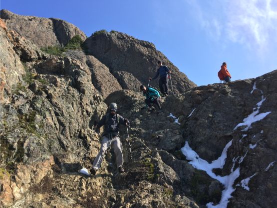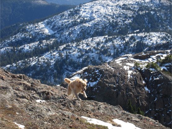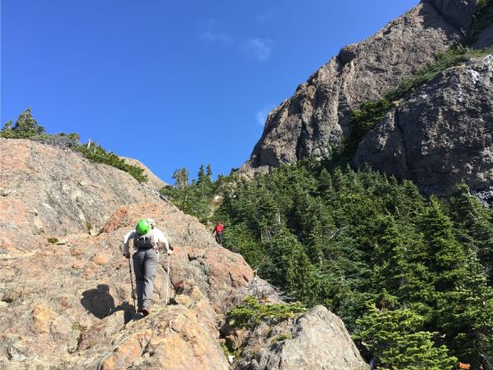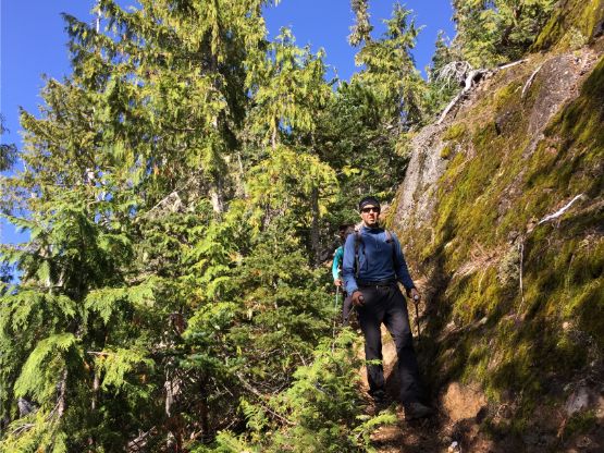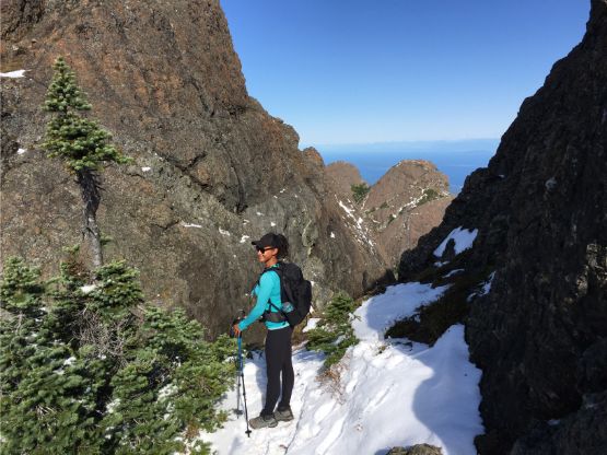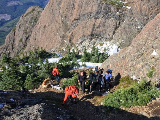 The first 1.5 km was walking up the decommissioned portion of this spur road and the official trail starts from the road’s end. The trail was very well defined at the start and wasn’t as steep as people made it sound, but after about 200 m gain the trail became a little rough and indistinct at places. We also had to hop over or duck under a few annoying dead falls and soon enough, we started encountering fresh snow. Meanwhile we passed at least five different group of hikers. I thought the island never gets crowded but maybe not on Mt. Arrowsmith on a sunny Sunday… We took a longish break before the route became “scrambly”. We came here prepared to scramble a lot of 3rd class ledges and chimneys but the reality was much simpler than what it appeared. We probably had to do a total of five 3rd class moves and none with notable exposure. The majority of the route would fall into the category of “hiking” although a very steep one. The path was obvious even on the scrambling steps.