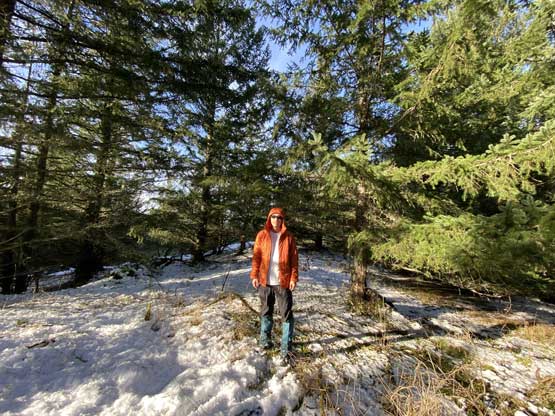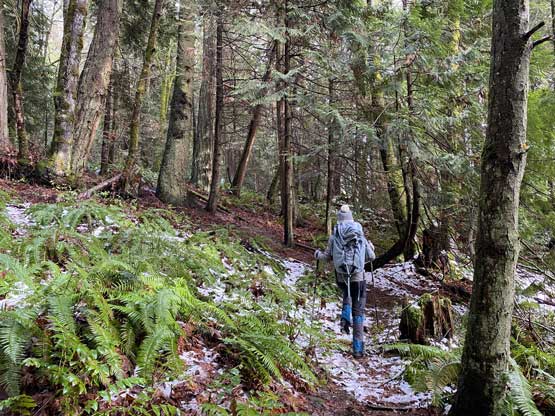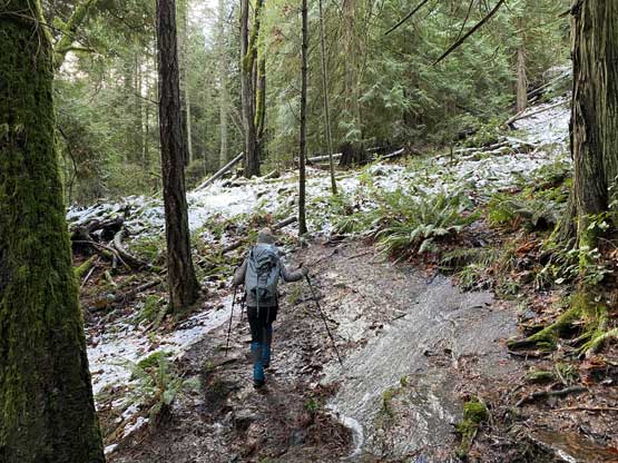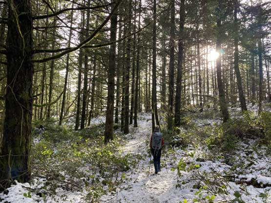 The parking lot was very muddy thank to the recent precipitation and the trail was a bit under-maintained than expected. There were signs at most junctions but the trail bed was faint at places, probably also due to the dump of precipitation. After a while we merged onto what seemed like an old and private logging road on the backside of the peak. A while later we left the road following the trail markers and the south viewpoint was soon reached. There was enough snow to post-hole whenever we stepped off the beaten paths.
