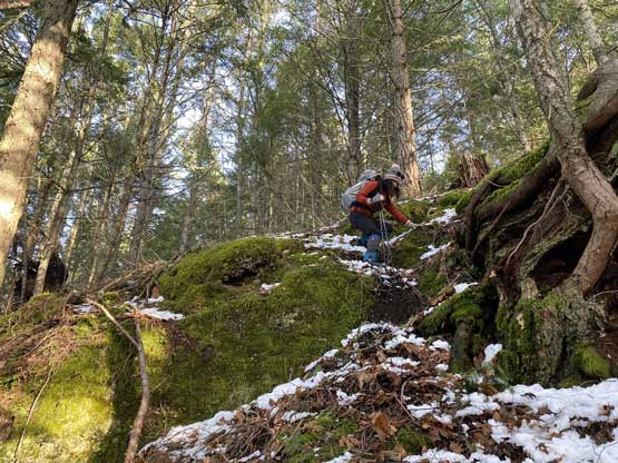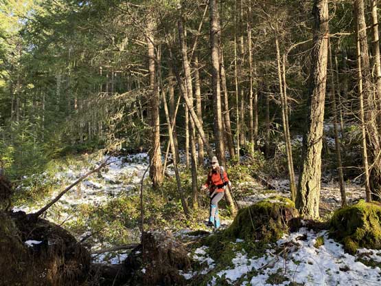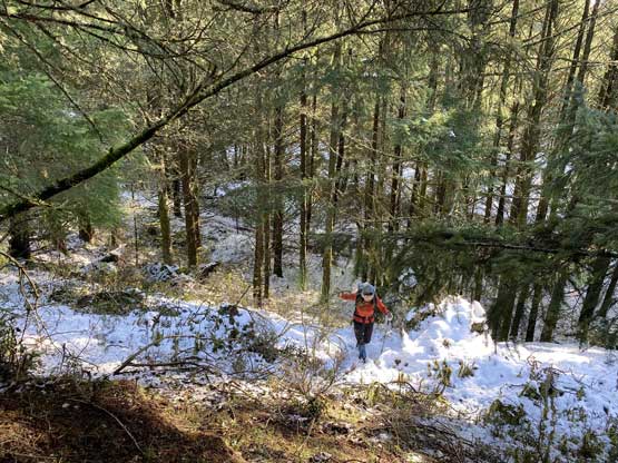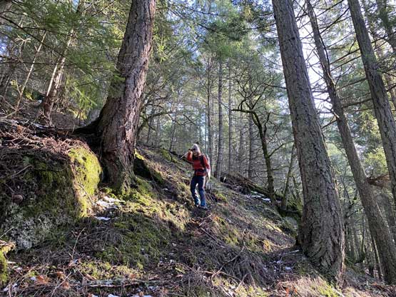 Once taking enough photos we walked north through open forest to the true summit. There was no view whatsoever other than trees, so we immediately resumed the traverse towards Sutil Mountain. I picked a line descending the west slopes towards the chasm that separates Sutil Mtn. with Mt. Galiano. I ancipated some steep bushwhacking based on the topo and satellite images. The terrain was steep at places but the bushwhacking was almost non-existent as the forest was old growth. In short time we were down to the creek that runs between the two peaks.