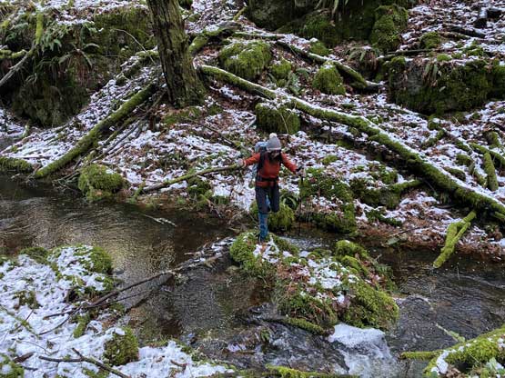 Once taking enough photos we walked north through open forest to the true summit. There was no view whatsoever other than trees, so we immediately resumed the traverse towards Sutil Mountain. I picked a line descending the west slopes towards the chasm that separates Sutil Mtn. with Mt. Galiano. I ancipated some steep bushwhacking based on the topo and satellite images. The terrain was steep at places but the bushwhacking was almost non-existent as the forest was old growth. In short time we were down to the creek that runs between the two peaks.