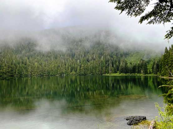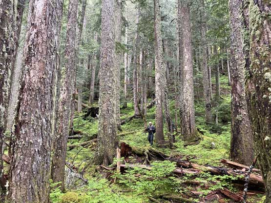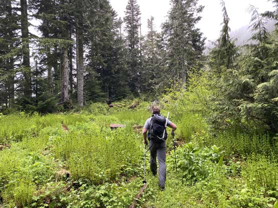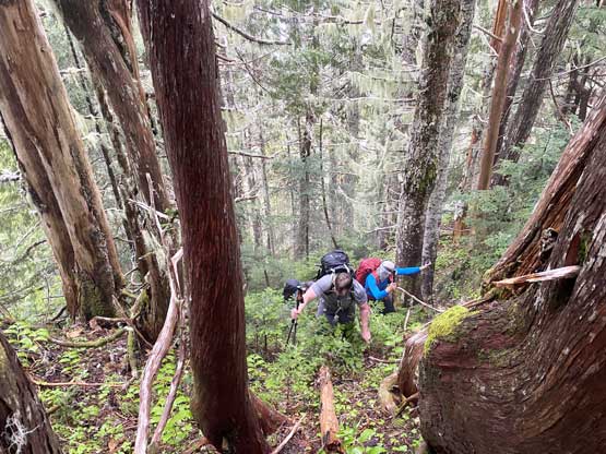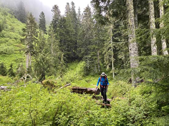 It soon became too cold to linger. For the upper rock step we found a different variation with similar difficulty. For the middle band Phil led us down using his bypass which certainly was a better choice especially for descending. And then we stuck close to our route thrashing and lowering ourselves down a few tricky and slippery steps. We then opted to stick closer to the ridge rather than dealing with all of those side-hilling, which turned out to be a better choice. We did feel the elevation regain to get back to the top of that sub-peak though. We then had some fast and furious boot-skiing and glissading down the north slopes of the sub-summit. The bushy descent back to Father and Son Lake wasn’t particularly fun, but wasn’t too bad neither with careful GPS work to make sure we stayed on route. It was still raining when we got back to the lake so didn’t bother to linger. The rest of the descent was uneventful.