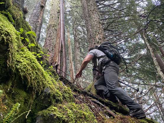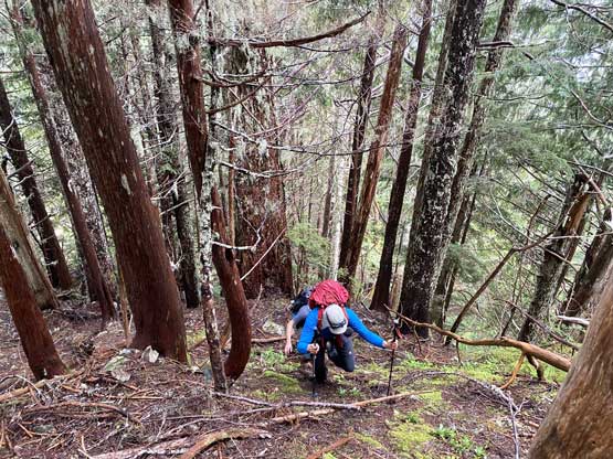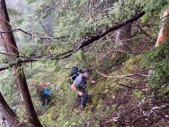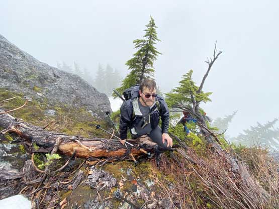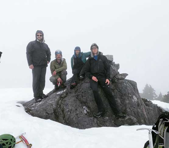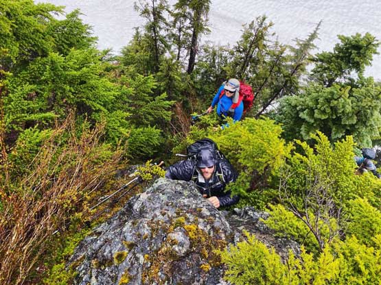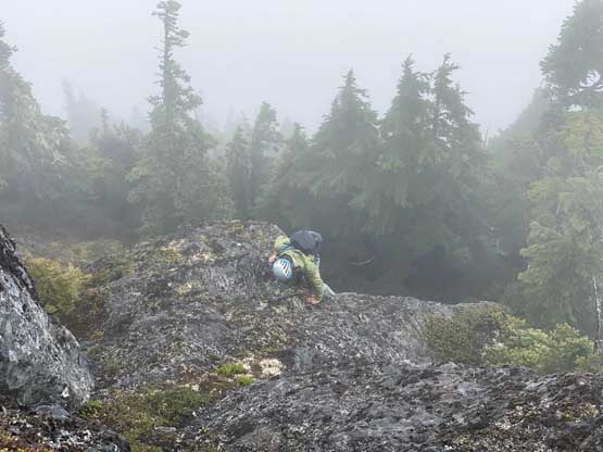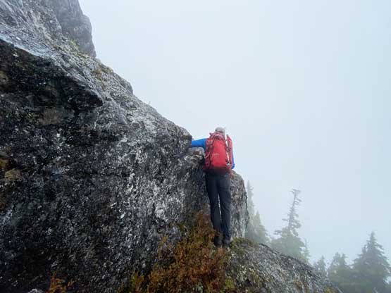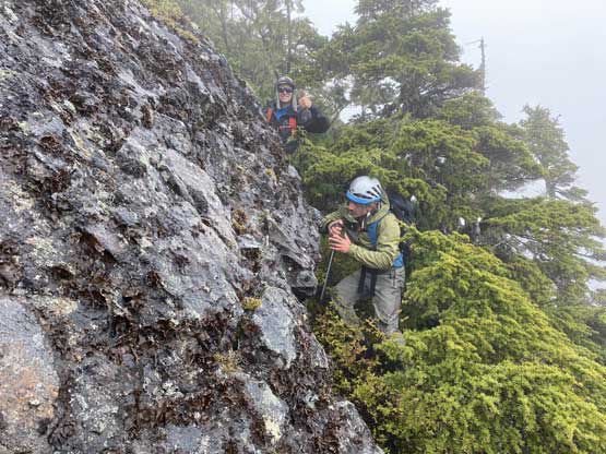 Given the density of peaks’ names on the Vancouver Island I was surprised that this sub-summit doesn’t have a name. We dropped down the gentle east ridge of this sub-peak and upon seeing another minor bump along the way we opted to traverse across the south slopes of it to save some extra elevation gain. The short-cut worked in the end, but I probably wouldn’t say it’s a better route as it involved a lot of side-hilling on wet grasses and bushes. The total elevation drop to the low point under the west ridge of Mt. McQuillan involved more than 150 vertical meters so it was downhill for quite a while. The weather had turned into light rain. The forecast was garbage. It’s shaping up to be a miserable day while looking ahead to the steep and bushy west ridge of our objective. The thrashing and scrambling started right off the bat that we had no choice but pulling up a series of class 3 steps using green belays. We got soaked to the bone in literally zero time. Then more bush and snow (sometimes steep) we encountered a mid-level rock band. Matt, Dustin and I scrambled the rock which involved one tricky move, while Phil found an easy, but wet and bushy bypass. The upper ridge involved more route-finding and a bit of class 3 scrambling but soon enough we were at the summit cairn, with no view of course but at least the rain stopped, briefly.