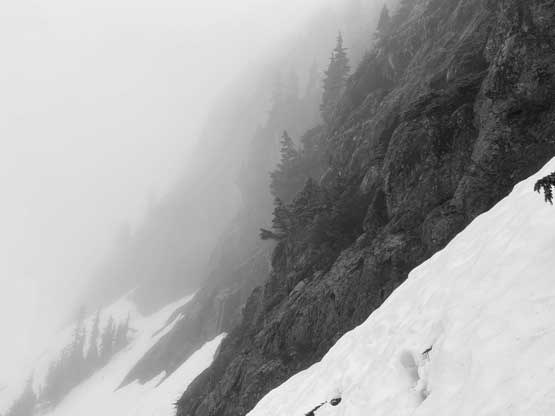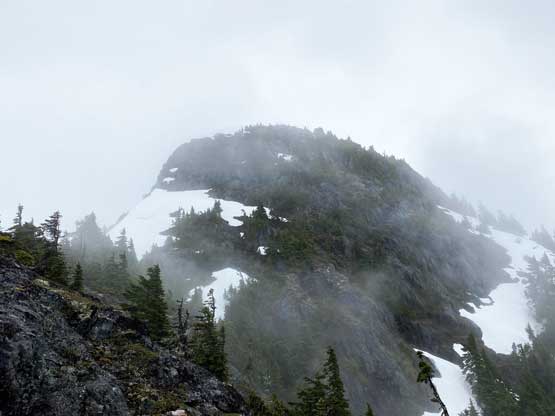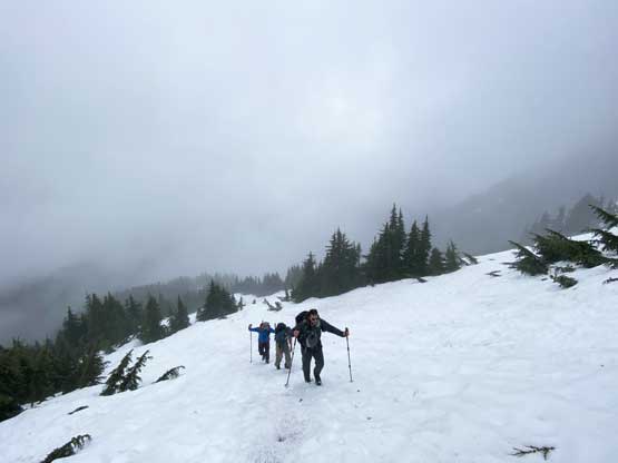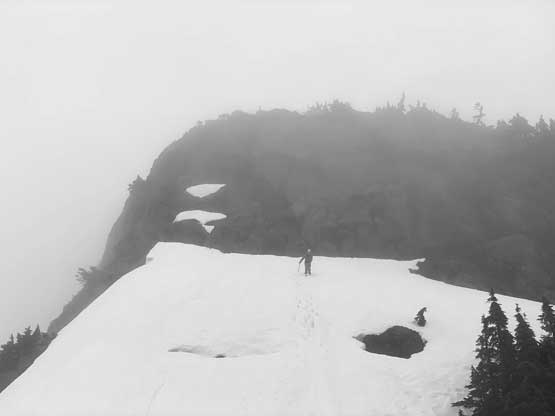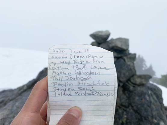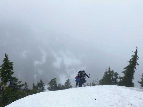 The weather was dreary so I opted to wear the waterproof winter pants instead of the summer pants as the others assured me there’s going to have some bushwhacking. The brushes looked awfully wet even at the parking lot. We made some quick work to the lake and contoured around its south and west side to directly beneath McQuillan/Douglas saddle. Phil had been up this route many years ago with a different group so he led the way entering the bush. We had some dead-falls and some brushes but nothing bad from the west coast standard. There’s one bluff that we opted to scramble straight up, which was fun. Higher up the grade steepened and we encountered more brushes but we weren’t far from the ridge at that point. Once gaining the ridge the travel became much easier that we even picked up a flagged path. Another hundred meter or so higher we started encountering snow and the snow soon became continuous. The visibility was poor but it wasn’t difficult to pick a line trending diagonally west (climber’s right) straight up the north slopes of the western sub-summit. The last bits were steep but the snow was very soft that an ice axe wasn’t needed.