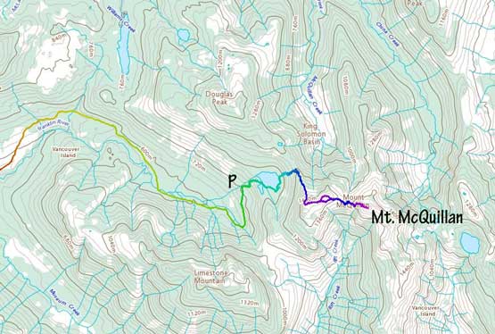 The area to the immediate south-east of Port Alberni on Vancouver Island is more known for the forested summits and heavy logging activities with logging roads running in pretty much every single valley and on every single peak. Mt. McQuillan is one of the taller and more prominent summit in that area. Traditionally the peak is approached from King Solomon Basin in the upper China Creek drainage but it can also be done by the bushy and 3rd class west ridge, which is approached from Father and Son Lake at the headwaters of Franklin River. Prior to this trip I had done zero research about this objective as I was joining a competent team of peak-baggers based in Nanaimo at the very last minute. I literally didn’t make my mind until 7 pm on Saturday evening and caught the 10:45 pm ferry ride from Tsawwassen to Nanaimo, with literally every single piece of car camping equipment sans sleeping bag…