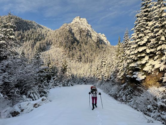 The plan was to catch up an hour of “sleep” but I was too tired to make that happen. In situation like this it would be either “zero sleep” or “a ton of sleep”. If I was that keen on the sunrise views then I should have started right away, but I didn’t. The result was sleeping in till 8 am when it was already bright and sunny. That was fine, as it seemed like we would be getting at least some views anyway. We eventually started almost another hour later. The decision was made for Kate to skip bringing ice axe and crampons in order to catch up some of the time loss. Plodding up the rest of the FSR to the road’s absolute end was indeed very scenic with an unnamed peak catching our attention on the climber’s left side. I had originally thought about bagging it but the weather eventually rolled in so I lost the motivation.