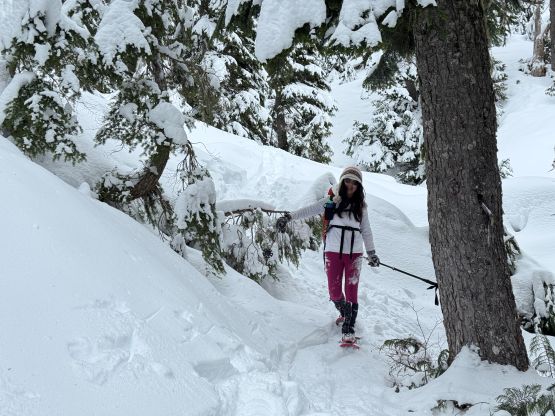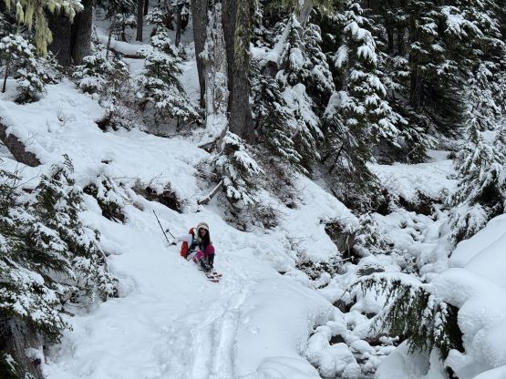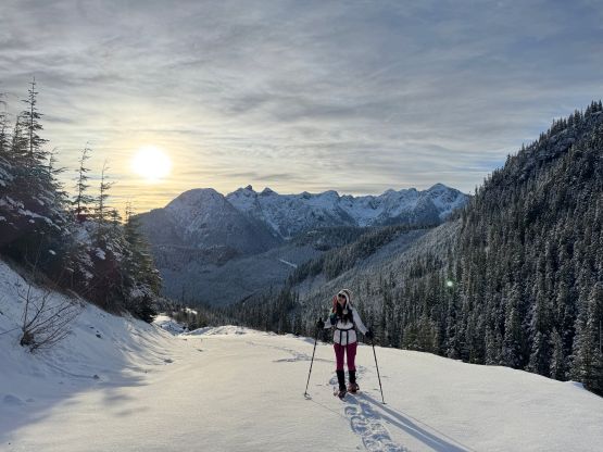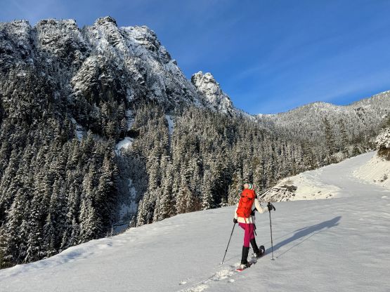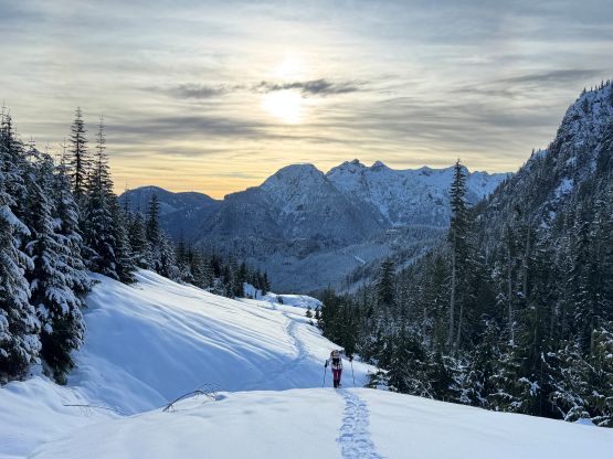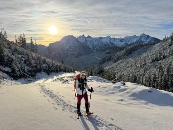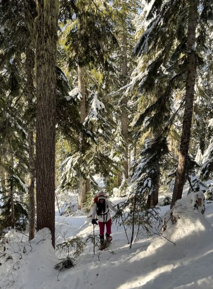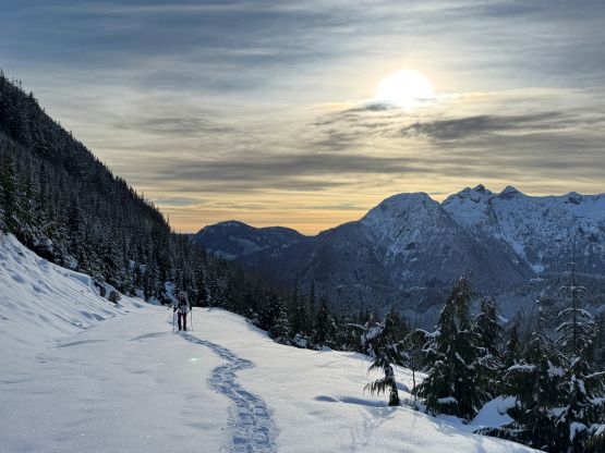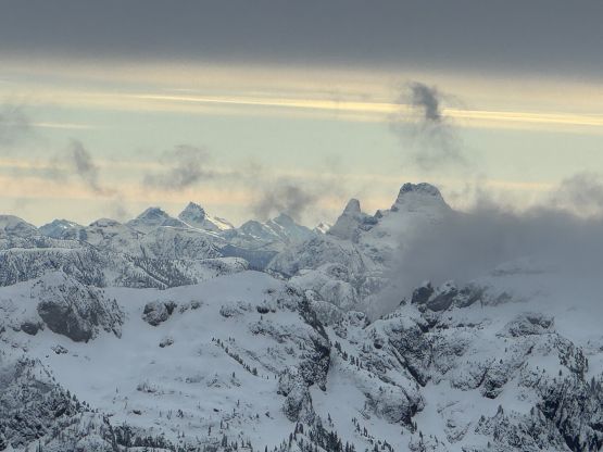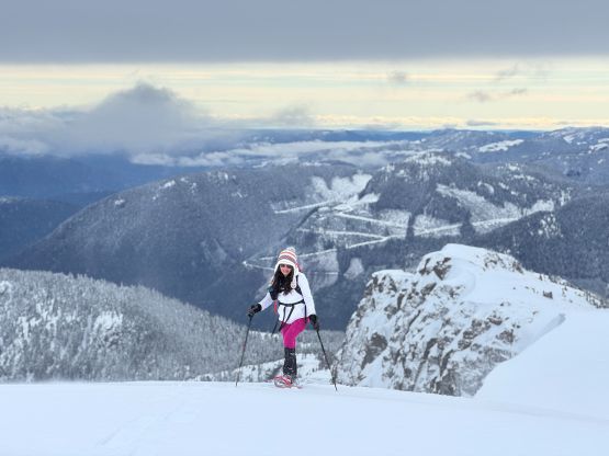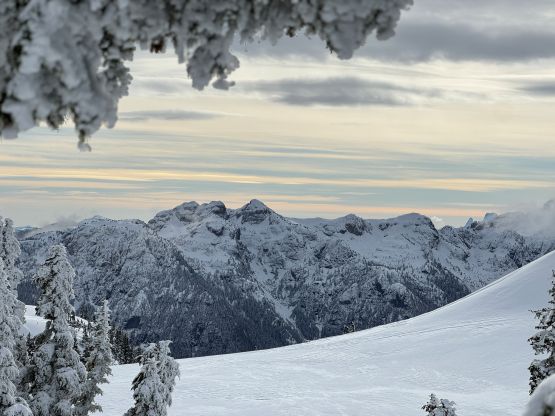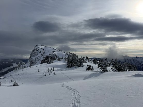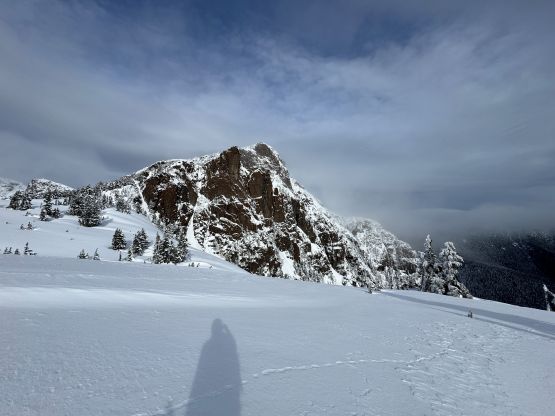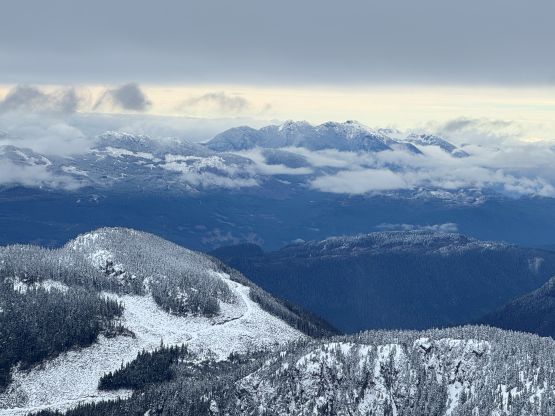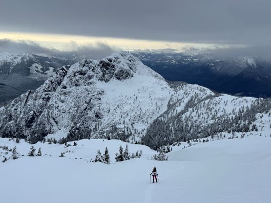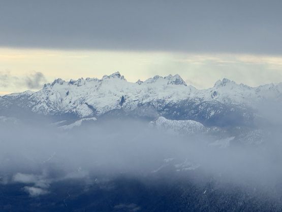 From the end of the road we followed Matt’s GPX track diving into the old growth forest. There’s one creek crossing that proved to be somewhat troublesome for Kate, that I had to give her a pole to grab/assist. The terrain then became quite steep. Matt suggested to take his descent route in order to avoid that “insanely steep bluff” but I thought veering climber’s right made the most sense. Indeed, my route though still very steep, worked out perfectly with nothing overly difficult even for Kate to follow. There was about 20 cm of fresh snow so the trail-breaking was a bit on the heavy side. Thankfully I had come prepared with the 30′ Lightning Ascents as I anticipated having to break trail for the entire way. I was definitely correct. Higher up we traversed across a scenic plateau onto Mt. Russell’s south ridge. The easiest attack would be traversing all the way to the west ridge but I didn’t think that was needed. There’s one slope to content with on the south ridge that would raise some avalanche concerns but not on this particular day. The slope angle was about 35 degrees and was right on the edge of the snowshoes’ capabilities. By this point the clouds had already rolled in so we quickly dashed up to the summit and didn’t linger for any longer than necessary.