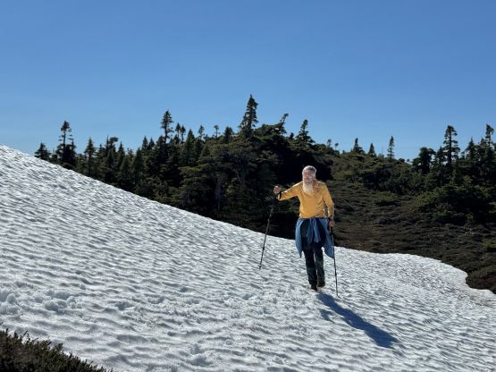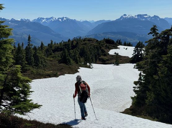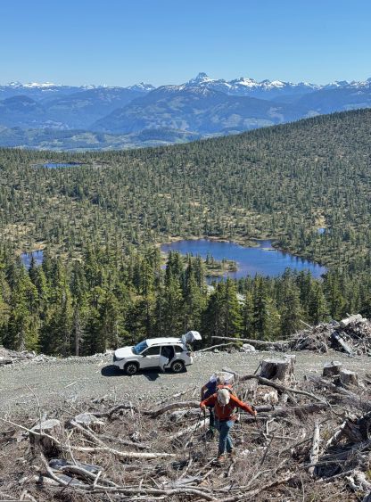 After completing Mt. Menzies with Kelly, Adam and Dave I thought we had enough time to pull off a secondary objective. The constraint was to get back to Campbell River to catch the 9:50 pm ferry to Quadra Island so with some careful calculations we decided to make an attempt on the Newcastle Ridge’s highest point. We weren’t very confident on the snowline elevation so if we ended up having to walk more than a few kilometers each way on the FSRs then we would turn around and call it a day. The snowline turned out to be much higher on Newcastle Ridge than on Mt. Menzies, that even the hiking portion was already dry. The road system following Matt’s GPX track was getting progressively rough but did not impose any issue to the Subaru until the very end. After scrapping the bumper crossing one enormous ditch I turned around and parked on the highest spur, only 200 horizontal meters from the absolute road’s end. Kelly had already done this peak so sat in the car to watch for our belongings.