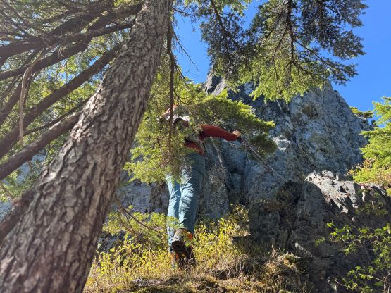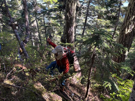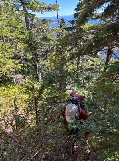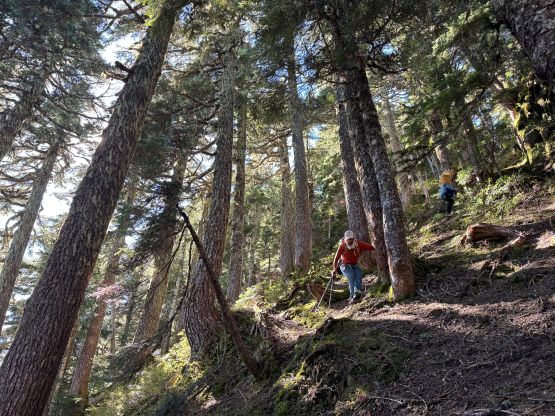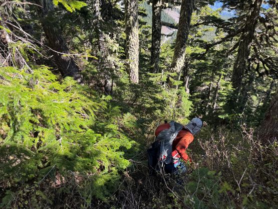 The bushes soon gave way to some open forest, albeit steep and slippery…