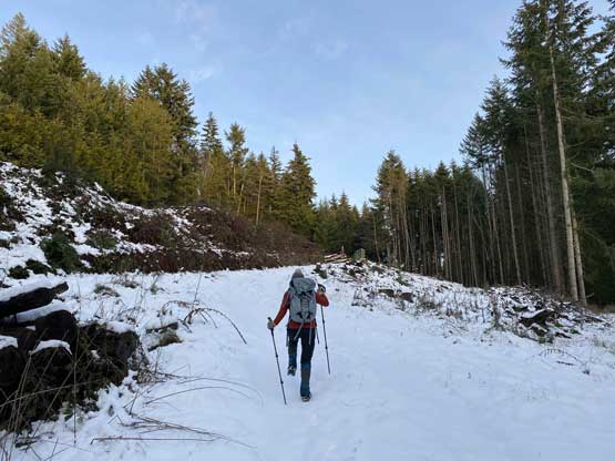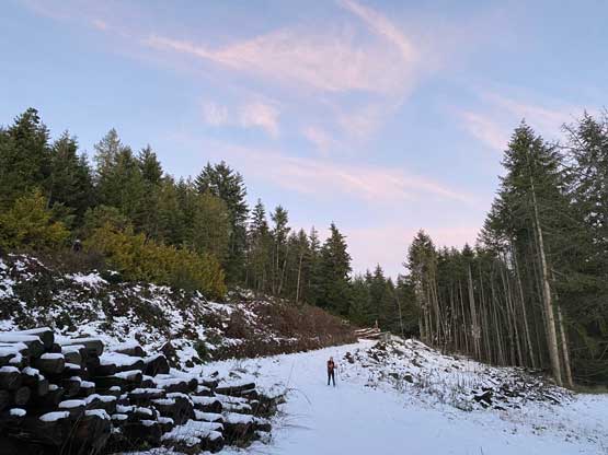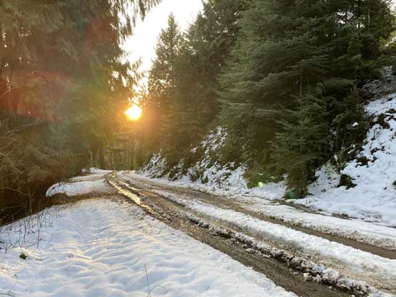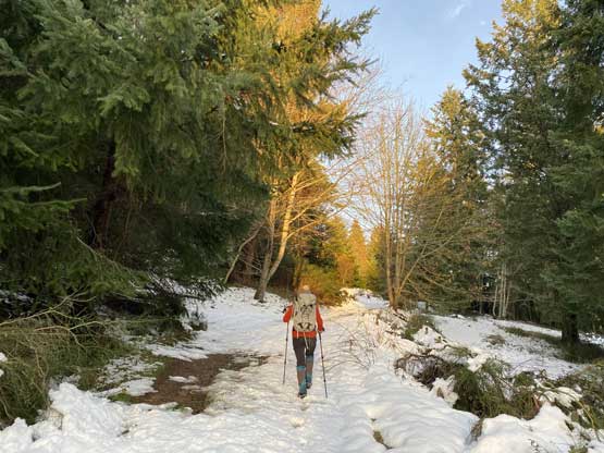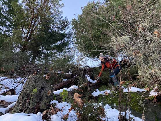 I did zero homework for this dumpster summit. I spotted some roads on the south side of Stockade Hill that could potentially shorten the hike and simply let Google Map direct us there. The highest spur road was not driveable thank to the recent dump of snow so we were looking at about 100 meters of elevation gain. After parking the truck we easily hiked up the spur road to the east side of the hill. The road seemed to continue in a direction that we didn’t want so I made the call to leave the road and bushwhack. We had a few stretches of bushwhacking through brambles type of plants and intersected a few higher spur roads.