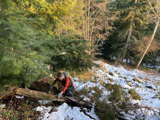 I did zero homework for this dumpster summit. I spotted some roads on the south side of Stockade Hill that could potentially shorten the hike and simply let Google Map direct us there. The highest spur road was not driveable thank to the recent dump of snow so we were looking at about 100 meters of elevation gain. After parking the truck we easily hiked up the spur road to the east side of the hill. The road seemed to continue in a direction that we didn’t want so I made the call to leave the road and bushwhack. We had a few stretches of bushwhacking through brambles type of plants and intersected a few higher spur roads.