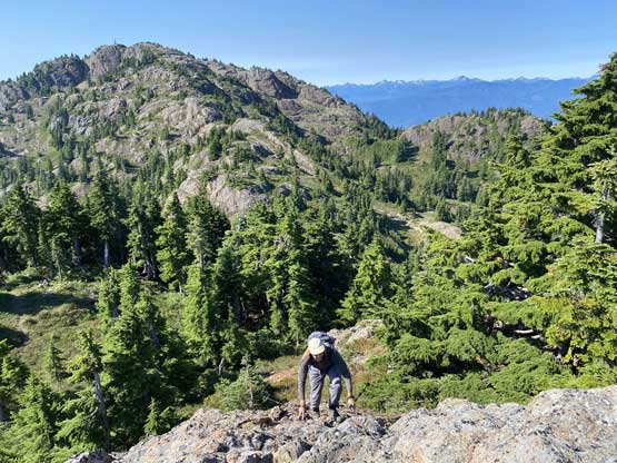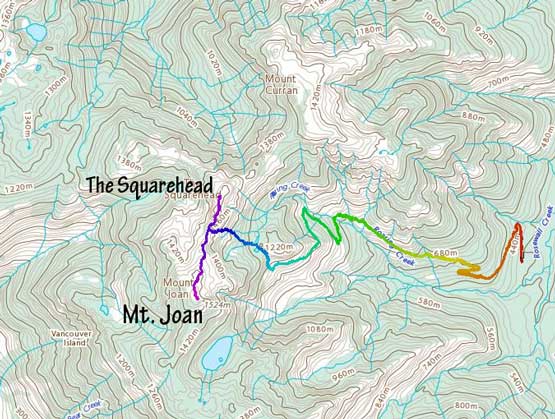 The Squarehead is officially-named but is rather just a pimple attached to Mt. Joan. It does not even boast over 100 m prominence although it does look like a peak from the lower north ridge of Mt. Joan. An unofficially-maintained trail traverses up and over this summit to link up Mt. Joan with Mt. Curran. Earlier in the day Alex, Vlad and I had hiked to the summit of Mt. Joan and upon returning we still had time, so decided to make a quick grab of this peak to boost our numbers. I was not too keen but it’s an easy number boost, so why not.