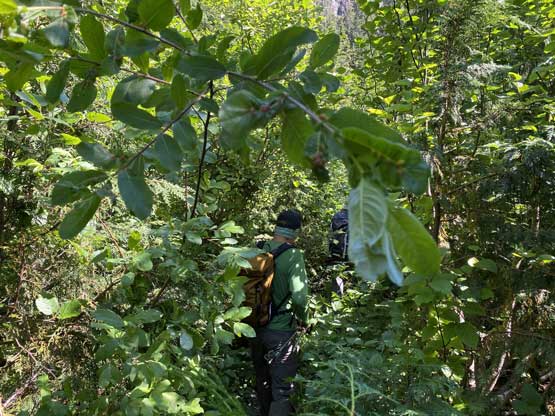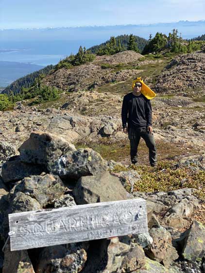 None of us knew much about the quality of the trail that connects Mt. Joan with The Squarehead so in my mind I was expecting bushwhacking and route-finding. The reality surprised all of us as the trail was very well-defined and easy to follow. In short time we had plodded to the top only to realize the true summit was one bump farther to the north. There’s even a register on this little pimple which also surprised us. By this point I had done fair amount of trips on the island and I can safely say that the hiking/mountaineering culture there is very different than in South Coast regions.
