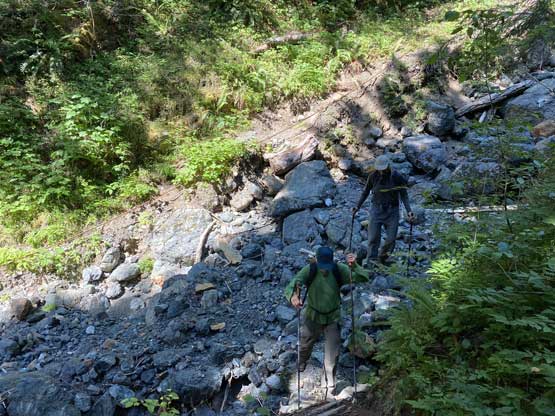 We all ran out of water at this point so we immediately started the descent. Alex set a blistering pace rushing down the trail and got us down to that creek in no time. We took a long break there recollecting our strength, both mentally and physically, before committing to the long ass plod down the trail and the logging road. My feet had developed numerous blisters from hiking in this hot weather in the past few days.