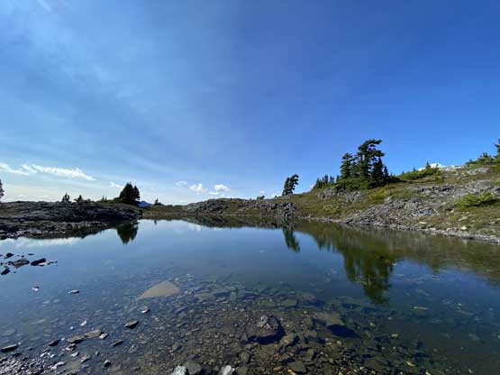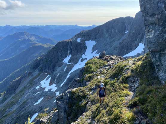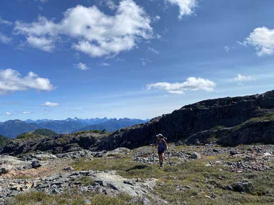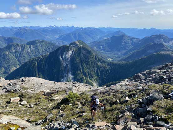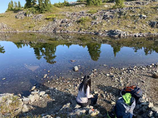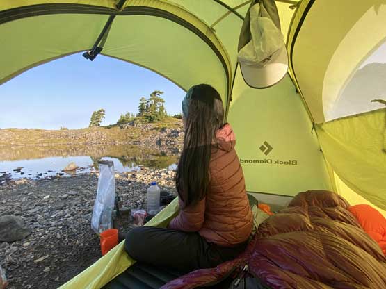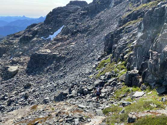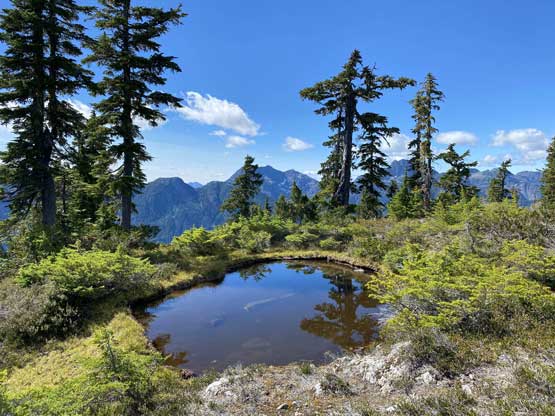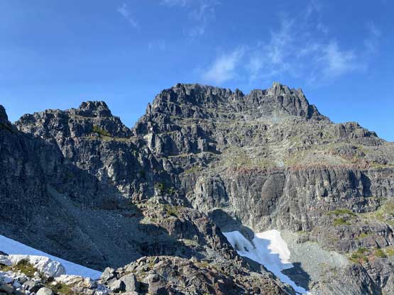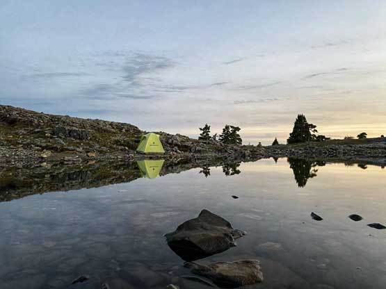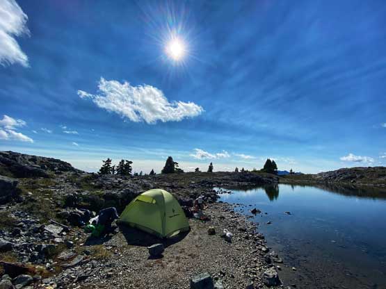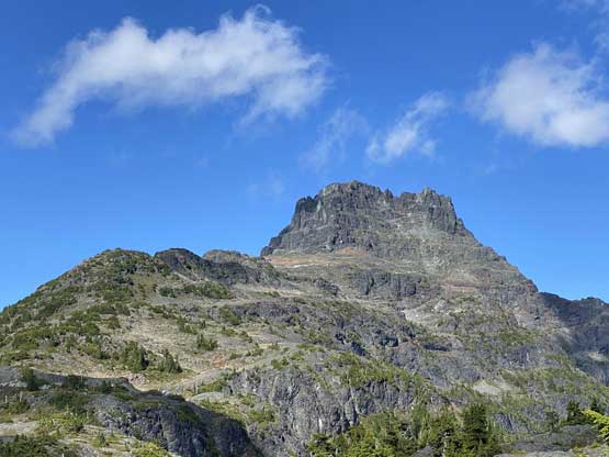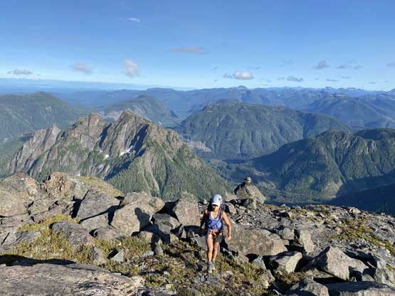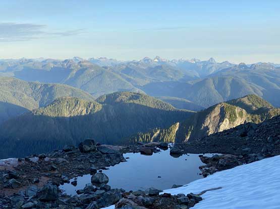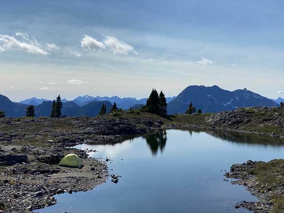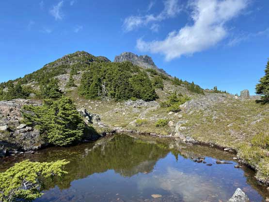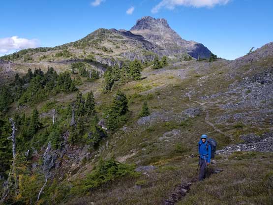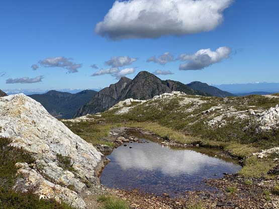 The way Winnie and I do trips is to not rush. We would take our time and stretch what seemed like just a day-trip into two days. Our goal for the first day was to drop camp at the tarn at around 1500 m and go bag the summit in the late-afternoon. We didn’t start the approach until 2 pm so we did have to hurry up a little bit. With the preloaded GPS tracks we had no issue finding the climber’s trail heading steeply onto the broad south ridge extension, and followed the fainting path towards the zone where we would camp. It took us a while to find the correct tarn to set up the tent. The density of mosquitoes was tolerable but the views weren’t as expansive as I was expecting.
