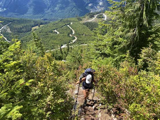Winnie had been off-work and wanted to get out for “anywhere with good weather for any number of days” in the beginning of September. I knew she really wanted to climb some classics in Rogers Pass and Bugaboos but I wanted to make sure she had done enough scrambling and mountaineering on loose rocks before moving onto the classic ones. I threw out the idea of bagging the northern island ultras and she agreed. Victoria Peak seemed like an introductory island climb for her so we aimed for this one first. We took the first ferry from Horseshoe Bay to Nanaimo and drove northwards to Campbell River. We then turned west towards Gold River and then up north onto Gold River Main. I was exhausted and took a nap somewhere down that logging road. After the much-needed nap I resumed the drive. The last few switchbacks had a few deep ditches bridged by sketchy-looking wooden planks. It’s difficult to trust the strength of those planks but I figured if other vehicles had made through then I wouldn’t have a problem neither. With that bit of fate I had no problem making to the road’s end in my trusty Tacoma.