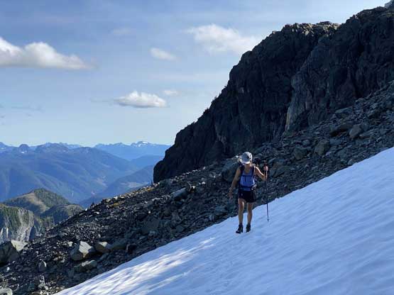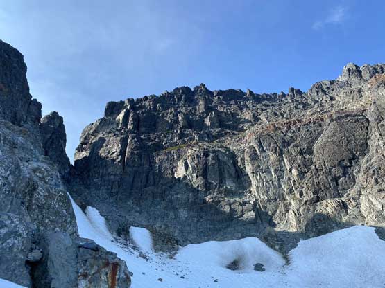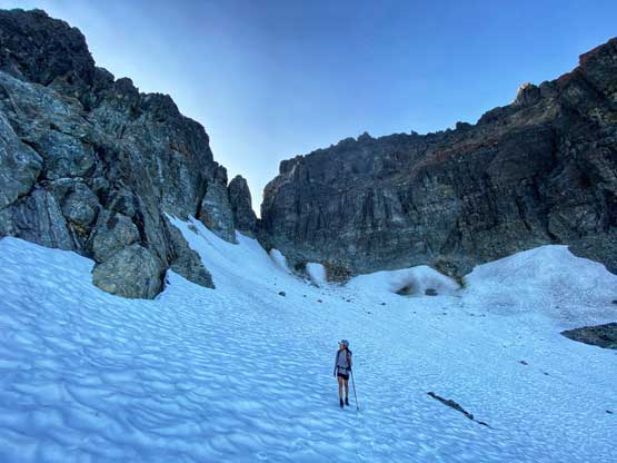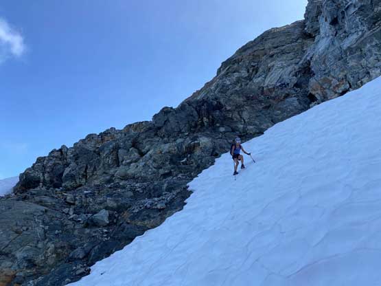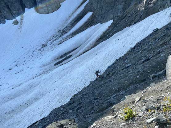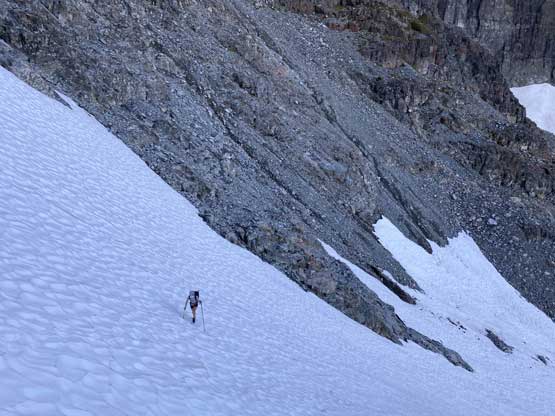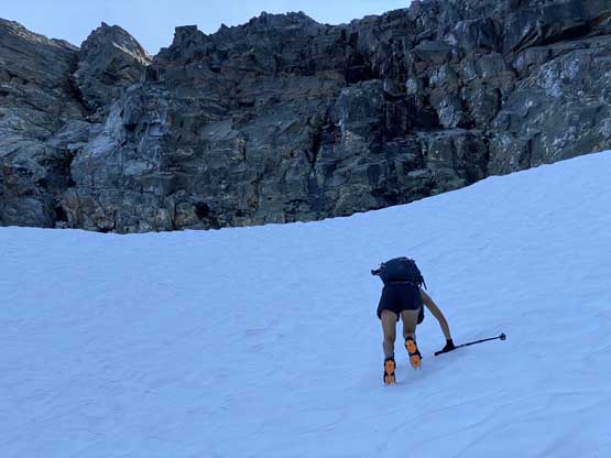 After setting up the tent we immediately started the ascent. I swapped trail-runners for my mountaineering boots. For the next few hundred meters we did not manage to stay on the most efficient line as we lost the trail many times and did some unnecessary bushwhacking. Above 1700 m we started to traverse climber’s right on an obvious wide bench aiming for a shoulder at around 1820 m elevation. This stretch was also not as pleasant as I expected because of boulders and micro-terrain up-and-downs. After rounding that corner we had a bit more of traversing before strapping crampons on for the short bits of steep snow descent. We lost about 50 m elevation on the snow but also found a neat spot to fill up the water bottles.