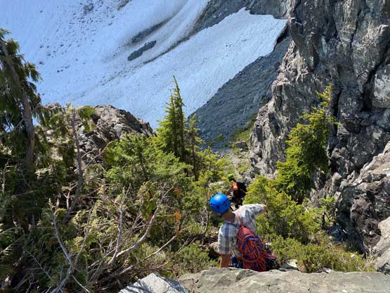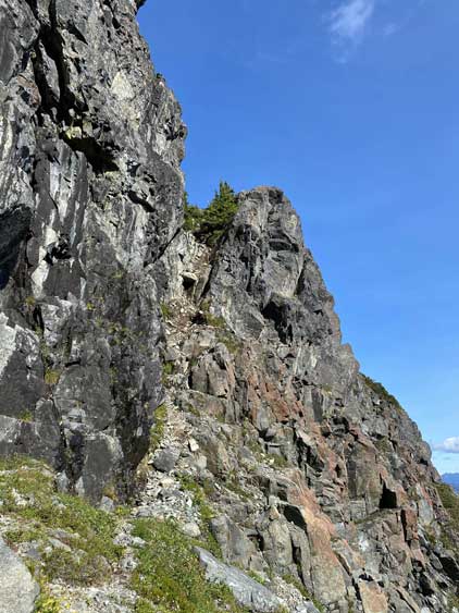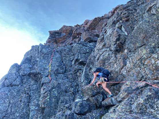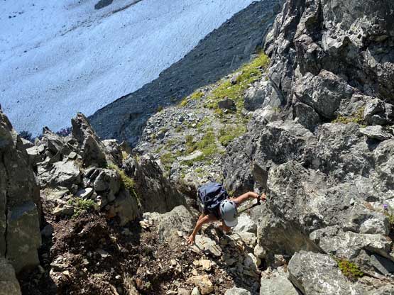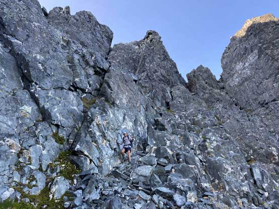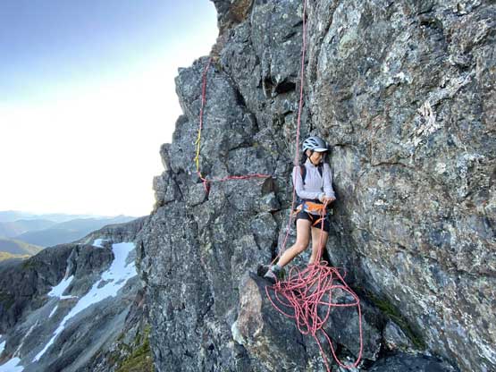 We had come here with enough beta about the route-finding on the lower south face that I had already memorized everything and didn’t need to pull out any information. We ascended some snow then some shitty scree to the base of a “hidden chimney” where we met two climbers descending. One of them turned out to be Kris Mutafov who recognized me out on Instagram later. Both of them were actually following me on Instagram. I was a little surprised as I wasn’t expecting people to recognize me out given how little I’ve done on the island. Above the “hidden chimney” we traversed the easy and wide ledge out right (east) all the way to the end where the short pitch was located. Winnie volunteered to put rock shoes on and did her first ever lead in the mountains and she did an absolutely fantastic job. Following the crux spot on my mountaineering boots was a little stiff without grabbing the fixed sling but elsewhere was easy. Assuming one does grab the sling I do agree with the 4th class rating.