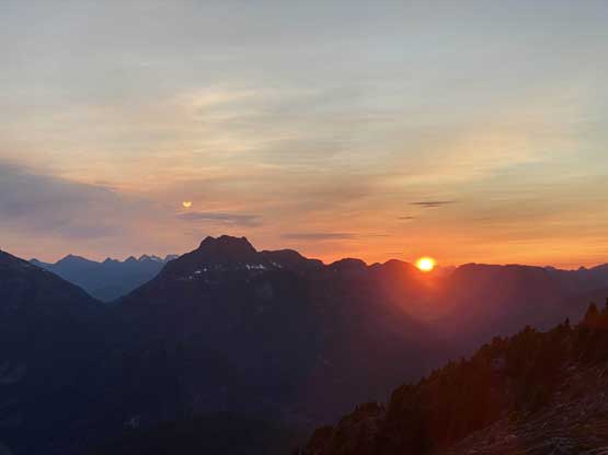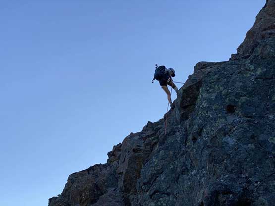 We were doing OK on time but we also didn’t have a ton of extra time to kill, so after taking the obligatory photos we immediately started the descent. We reversed our route down through the upper face, then did one rappel to get off the technical crux. Down-scrambling the “hidden chimney” was not as bad as I thought. We picked a slightly different line down through that shitty zone below the hidden chimney, then made some quick transitions to handle that snow patch. By the time we scrambled back through that obvious bench around 1750 m we were right in time for the sunset. We hurried up a bit and made back to camp just before it’s too dark to see.