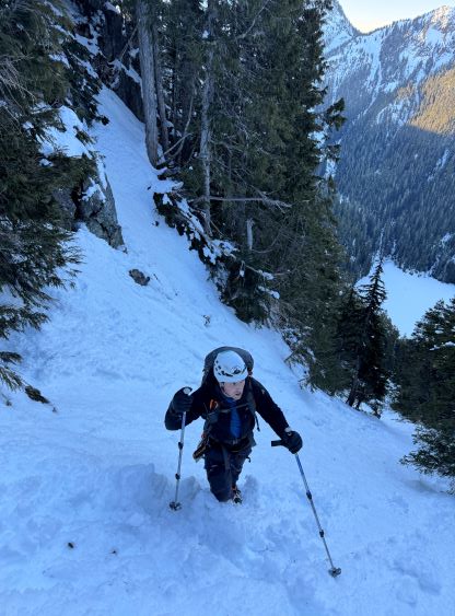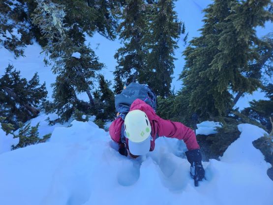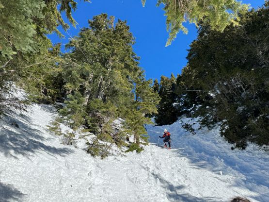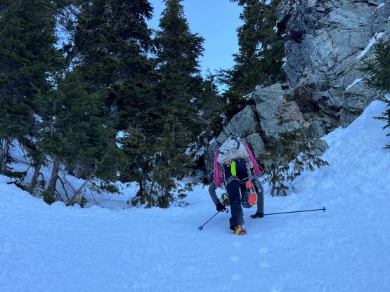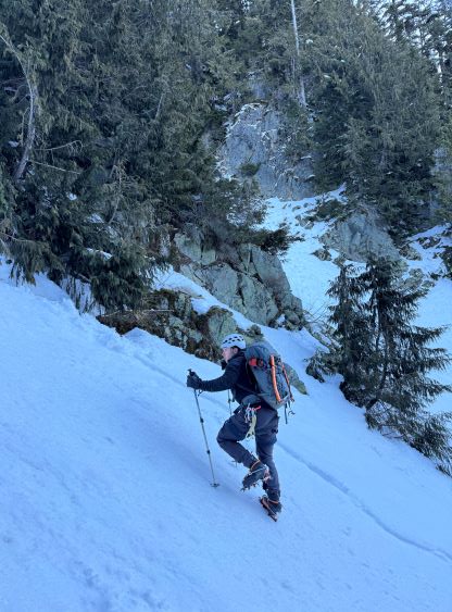 The bottom of the gully was more like a slide path and it was chocked with alders thank to the lack of snow. We took a break there eating some food, and the stoke level was not high. Thankfully we discovered soon that bushwhacking was not actually needed as the middle of the gully was nice and open. I led us up for about 50 vertical meters before making the decision to don crampons. I also left a trekking pole behind and took an ice tool (Petzl Gully) out, whereas the others managed this entire gully in crampons and two poles. The grade of the gully was mostly 35-40 degrees but the condition was icy and a slip could mean a long way down, so I did appreciate having the ice axe. Due to the lack of “beta” we all anticipated some “climbing” in this gully but the result was disappointing. It was mostly just a long slog to reach the col, and hardly any front-pointing on steep snow was needed.