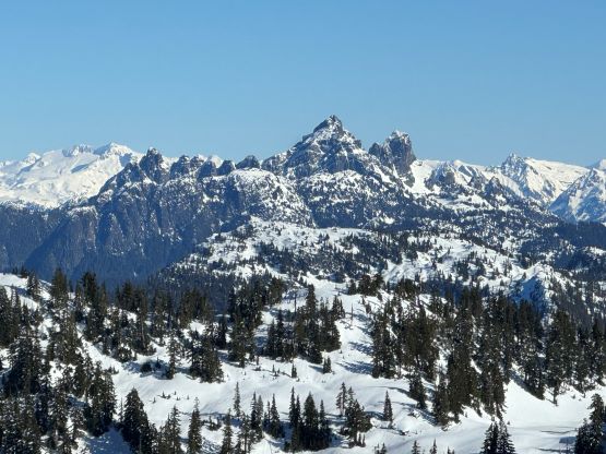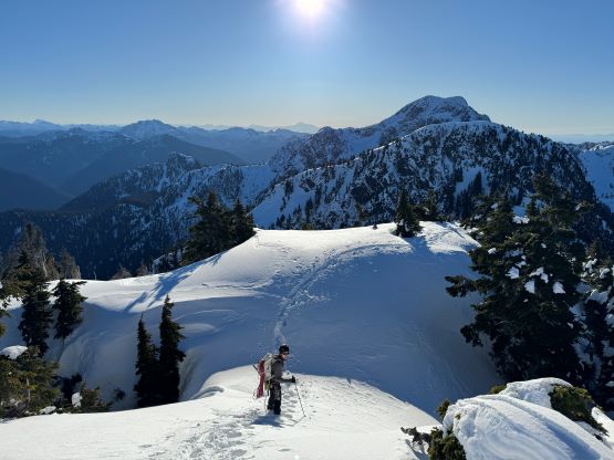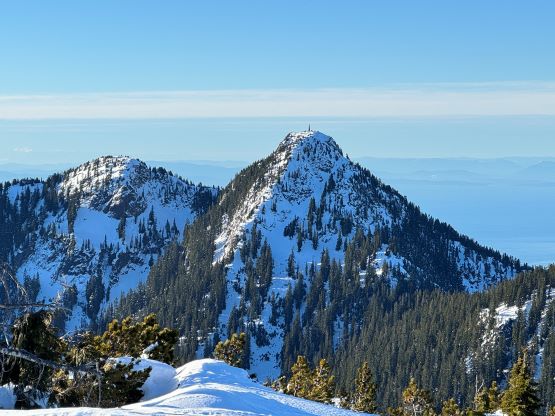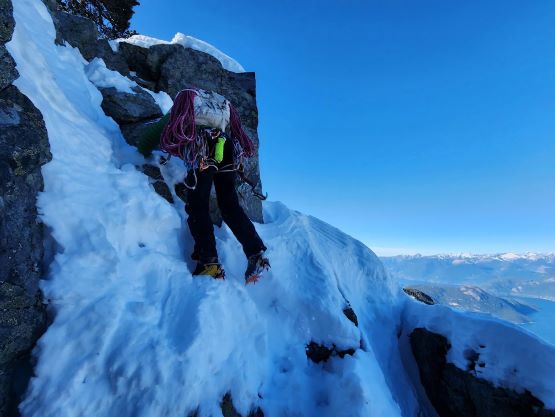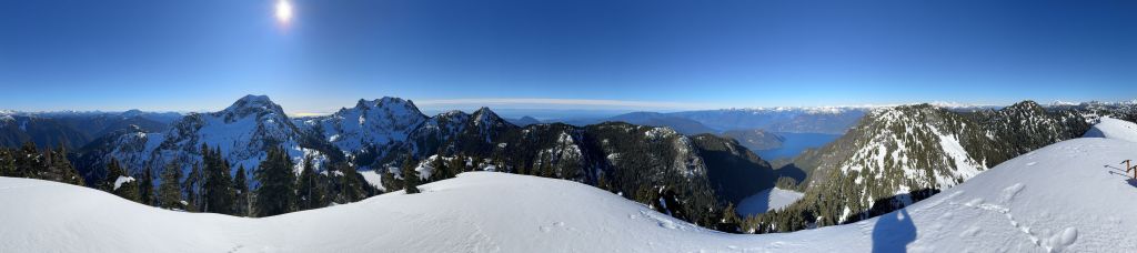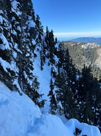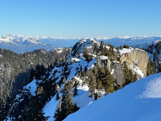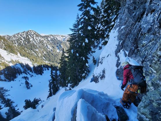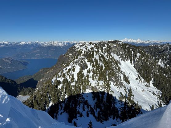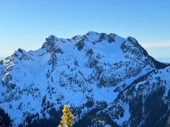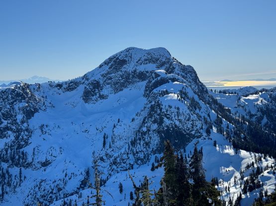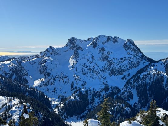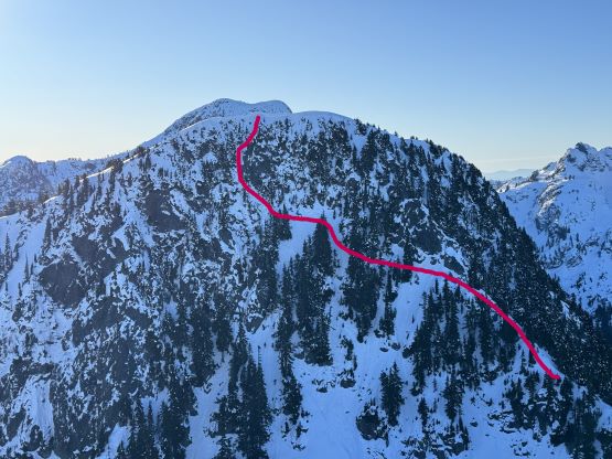 “Gotha Peak” and “Coburg Peak” are the unofficial names of two obscured peaks in the North Shore Mountains hidden behind the popular Howe Sound Crest giants. The original source of the names is bivouac.com but these had been widely adopted elsewhere. They are not so obscured now thank to the Bagger’s Challenge group. The scramble up “Coburg Peak” was used to be a challenge, but the entire way has been flagged and a fixed line has been installed on the crux (class 3, minimal exposure) so this has become a lot lamer nowadays. Most, if not all of the ascents were done in summer and the standard route goes up and over “Gotha Peak” to access “Coburg Peak”. For peak-baggers it makes no sense to leave one of them behind so I’m not splitting the trip report. About two years ago I ascended Hat Mountain in February and took a picture of the gigantic gully system leading up to Coburg/Gotha col from the SW, and I instantly decided to do them in winter as well. The challenge would be the lack of “beta” (virtually none) and the fact that Coburg Peak requires 3rd class scrambling. I had no idea of what exactly to expect in winter, so I needed a strong group capable of snow and mixed climbing along with some bomber conditions to pull the trigger.
