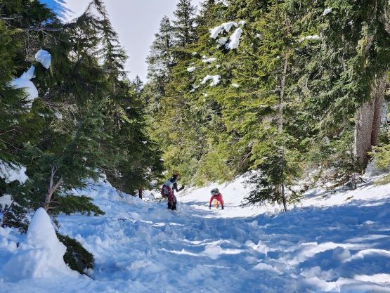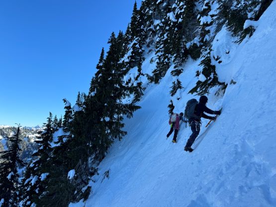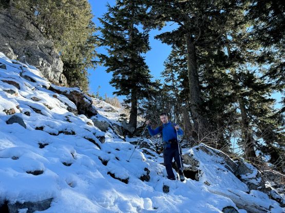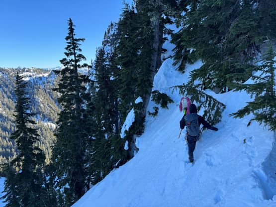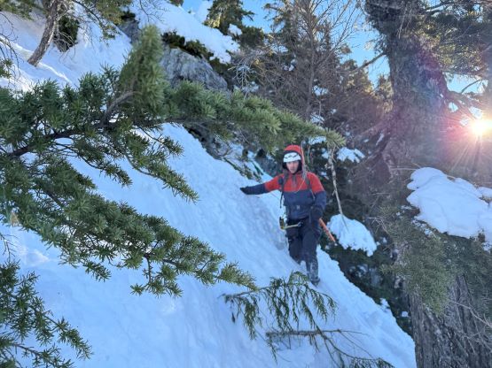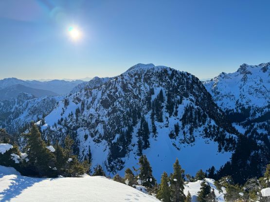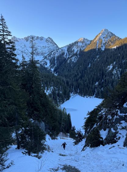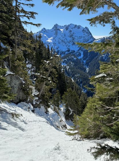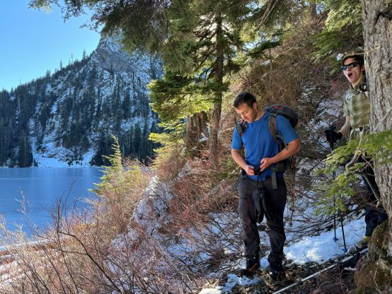 It had taken us 6 hours to get here including the ascent and descent of Gotha Peak, so we were doing excellently on time. We took a fairly long break on this sunny summit to soak in the views, and eventually made the decision to descend the standard route for simplicity. We anticipated a few rappels but were able to down-climb the entire way while doing the route-finding. It was not obvious where to go exactly, but it also didn’t matter that much. I simply led us down staying as close to the ridge as possible. A few drops forced me to down-climb skier’s left to bypass, and we eventually arrived at the top of the crux. We could see the fixed line frozen in the snow (not useable), but the crux looked doable so we did not bother to take the rope out again. The hardest was to down-climb that initial step above Gotha/Coburg col. The descent of the SW gully was not difficult but required some caution as the condition was still icy at places. A slip could still mean a long slide so I made sure to stay alert throughout the descent. We did most of the descent facing outwards and that required a higher level of concentration. The rest of the return was uneventful. We collected our ditched gears from various places and I did change my boots back to the trail runners. Chris opted to wear his boots all the way down to the trail-head. We jogged at least half of the trail distance and finished the round trip in just over 9.5 hours. Again, to keep up with Noah and Chris I needed to be 100% in my elements so I only took about 200 photos for the day, which was definitely a low record. I took over 150 photos in a day even on trash-bagging trips.