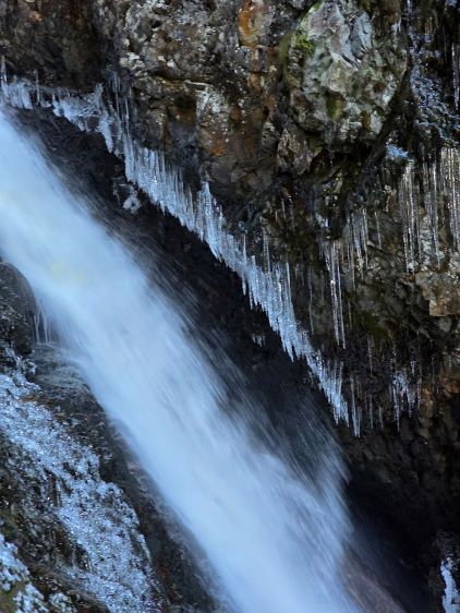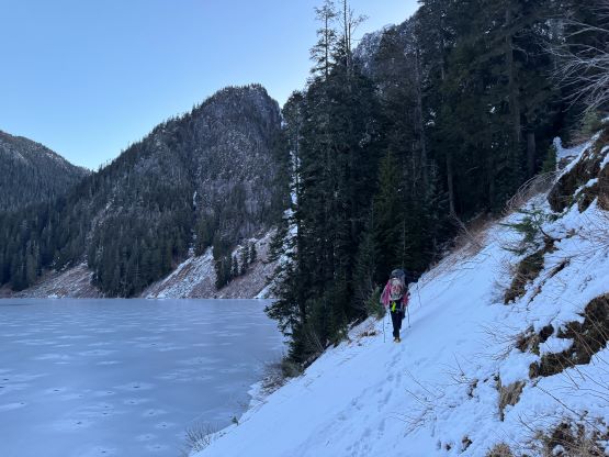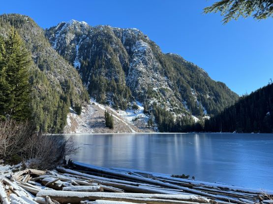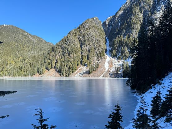 After spending ~15 min. at the Church to test out the rental gears I drove us to the trail-head in my Corolla. The drive was less than half an hour and the parking was obvious. The official start of the Howe Sound Crest trail was about 200 m south down the highway, but we decided to hop over the fence and plod up the quarry road instead. I always prefer the shortest possible way. There were a few confusing junctions that made me to check the GPS regularly. I did download a set of GPX tracks. The tracks were made by a party doing the standard route in summer, but the approach was the same. Chris and Noah are two incredibly strong climbers that I had to max out my uphill pace to keep up with these guys. I still fell a little bit behind on the steep grunt to Deeks Lake but I was also carrying the 60m rope. We made to the lake just when it’s bright enough to turn off the head-lamps. The lake was frozen but we could not trust the thickness of the ice, so we followed the trail to circumnavigate the lake in a counterclockwise direction. About 2/3 of the way across we came to a steep slope and decided to finally swap the trail-runners to mountaineering boots. I also gave the rope to Noah to carry as I was tired. We had been walking on snow and ice for a while and I worried about descending this section on trail-runners on the return. The boots did help a lot on the traction. While grunting towards the upper (more frozen) lake we located a downed foot bridge and hopped across the creek to the east side. A few minutes afterwards we followed Chris’ lead ascending diagonally up an open slope to cut into the SW gully. This slope was not the most pleasant with lots of Devil’s Club and boulders covered in no more than 30 cm of fresh snow.