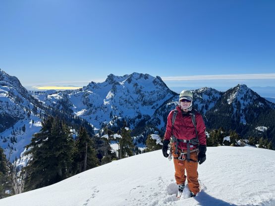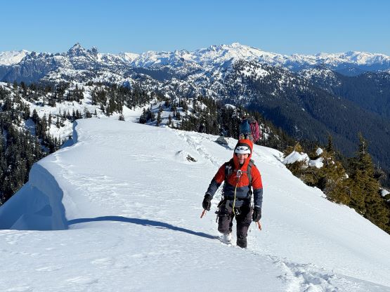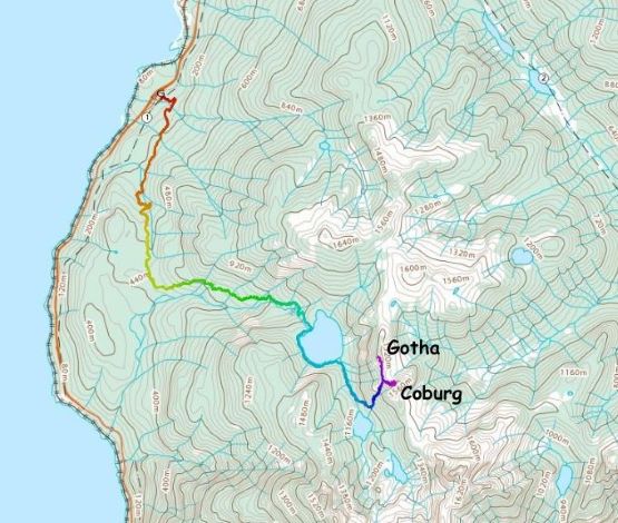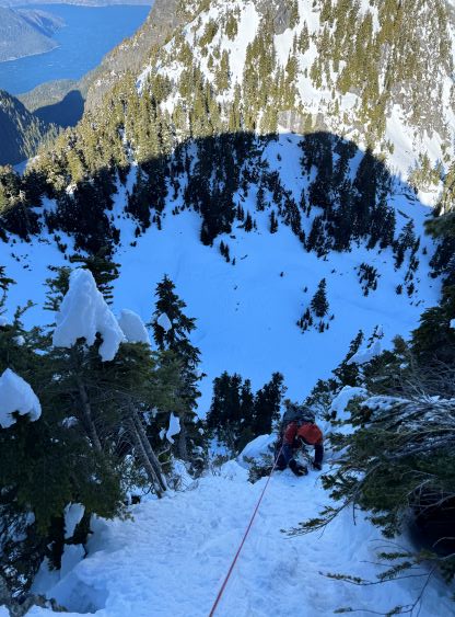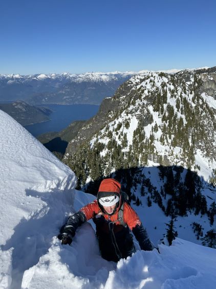 Throughout the ascent of Gotha Peak we kept looking back and we had formulated a few lines on the north face of Coburg Peak. The standard route looked a bit lame and we had brought a 60m rope and Noah’s capable of climbing M4 and WI6 so it made no sense to just plod up the easiest possible way. The condition was good, so we decided to try a “couloir direct” on the north face. To get to the couloir we opted to climb the NW ridge to the base of the standard route’s crux, and then do a long rising traverse across several steep bowls. Even the initial step out of Gotha/Coburg col required some shenanigans and I actually thought this step, though without exposure, was actually one of the cruxes. I then led us wallowing to the base of the standard route’s crux and it was there that we made the final decision to try the perhaps-new route on the north face. Noah and Chris was more keen, so I followed their leads traversing across the few increasingly-steep bowls. The last section of the traversing was quite exposed and had taken Noah quite a while to solo across. Chris and I gingerly followed, and we decided to pitch it out afterwards. The actual couloir was thankfully not too terrifying. Noah ran out the full 60 m pitch placing only one pro about 2/3 of the way up, and belayed us up from the summit. Aside a challenging mixed move the couloir itself was mostly just 50+ degree snow climbing. The top-out did require climbing through a small cornice. With a top-rope belay it was actually quite fun.