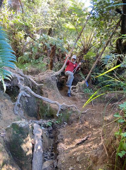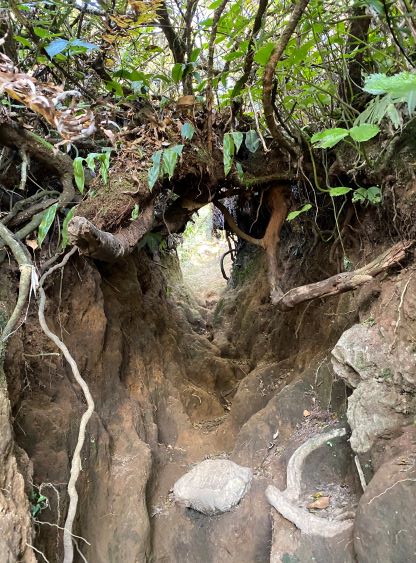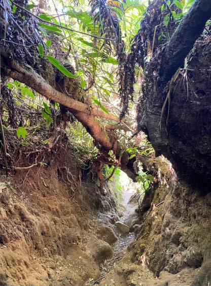 The entire ascent can be divided into two stages – the lower cobblestone pavement to the large camp near Gede/Pangrango saddle, and the upper tree roots/mud scrambling to the summit. Most of the lower stage was done using head-lamps and the trail bed was entirely paved by the irregular rocks. It was painful to say the least, and would only be worse on the descent. The only notable feature was a crossing of a hot water creek. That whole area was steaming and felt like a souna. The rocks were also extremely slippery that even I felt quite tricky to not slip and wet my shoes. Near the aforementioned large camp Adam required a food break, but I did not need that and I was wearing absolutely no clothing beside shorts. I disliked making any unnecessary stop because I didn’t want to get cold, so the decision was made to regroup on the summit, about 700 vertical meters higher. I anticipated some incredible sunrise views from the SE slopes above Gede/Pangrango saddle, but the result was disappointing. There’s very minimal view throughout the climb due to the thick canopy. The scrambling on tree roots and mud tunnels was also quite intense at times, requiring 3rd class moves. The summit was also extremely disappointing with only a glimpse of view towards Gunung Gede. I wondered why the hell they charged people such expensive fees to just see this.