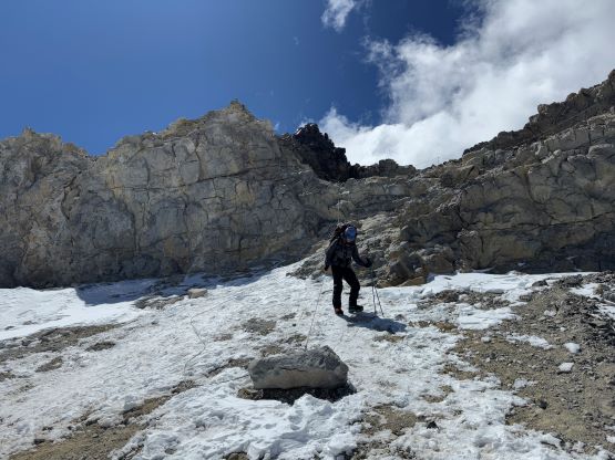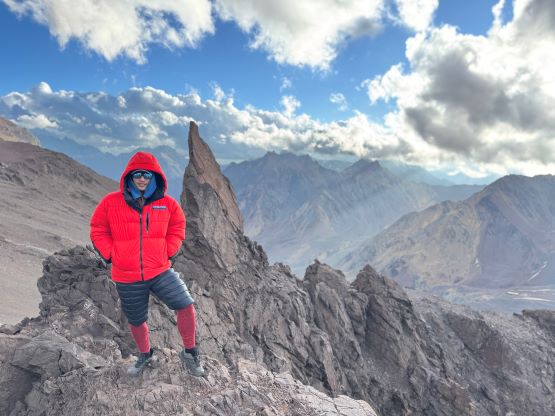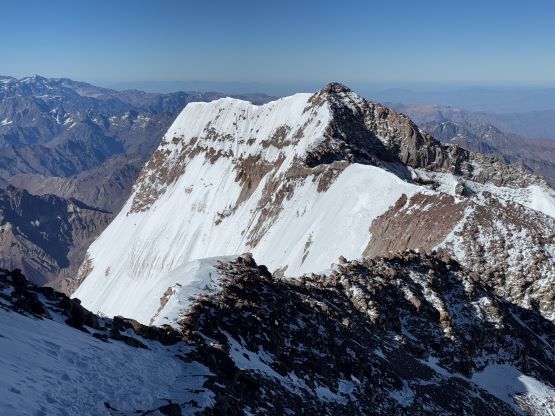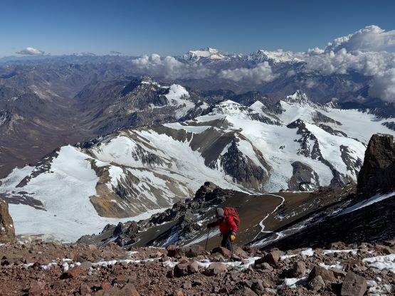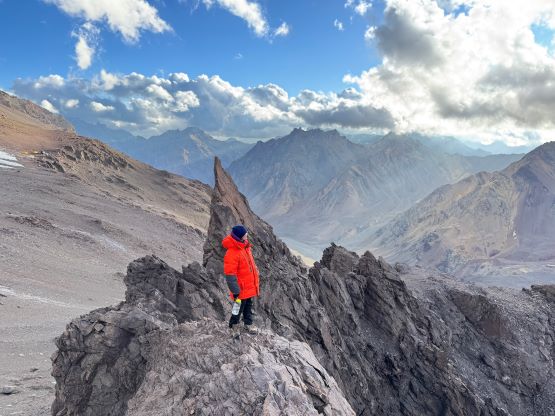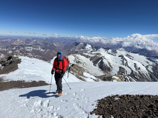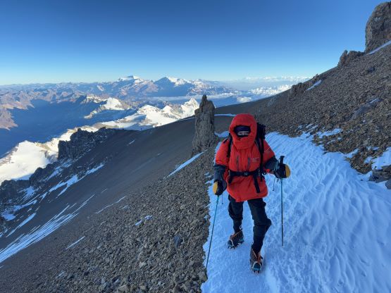 It was becoming increasingly cold but I persisted onward in just t-shirt with a thin puffer. Erica had donned her 8000m down mittens and quickly made for another transition to don the 8000m (Absolute Zero) parka. I had bought that parka back in 2020 for Denali and Logan but never ended up using it, and the first time it being used was here on Aconcagua, for Erica. I myself also donned the parka which is the Feather Friends’ Khumbu, not as warm as the Absolute Zero but still warm enough for Denali’s use. The balaclava restricted my breathing so I gave it up. I did not need to don the down mittens and neither did I use them on Everest nor Mercedario. My fingers’ circulation was definitely better than the averaged, that the 60-dollar MEC gloves were sufficient enough for all of my high altitude climbs as well as the coldest days I’ve spent in the Canadian Rockies. It was the time to start that infamous traverse, which thankfully was without much head winds. The crampons (mine being the Petzl Irvis Hybrids) were finally stepped on here, but the ice axes were never used. The traverse was nowhere as steep as people made it sound like, that for someone comfortable on steep snow it was rather trivial, but it was physically and mentally exhausting. I finally hit my wall at around 6500 m elevation and had to stop frequently to breathe. Erica, on the other hand, was able to keep up by only breathing through her nose, which I thought was amusing. Our time from C2 to the summit was 5.5 hours and this was on par with Eric Gilbertson and Connor McEntee’s time, and I did not believe those guys did this peak by only breathing through their noses. Erica did have AMS symptom of being extremely sleepy and fatigue but we persisted on. The grunt up through the Canaleta was as grueling as people made it sound, and the final 100 m up the SW Ridge was the worst. I eventually made Erica to go ahead and she quickly passed the guy and lady ahead, becoming the second to summit only after that soloist in the Samaya tent. I also managed to past the guy but fell shortly behind the girl, becoming the 4th summitter of the day. The five of us here formed the “team 1” of this day and we all made some amazing time.
