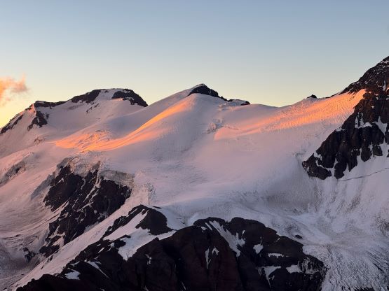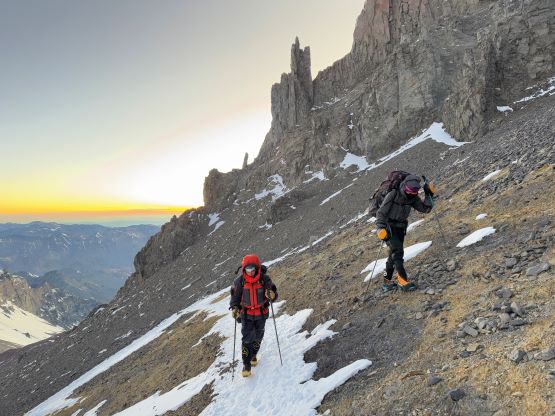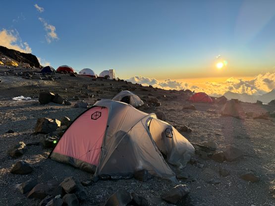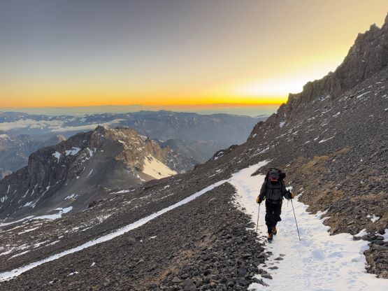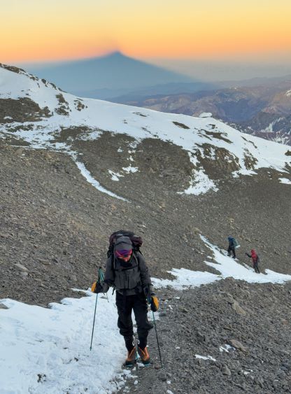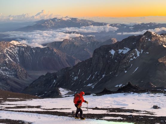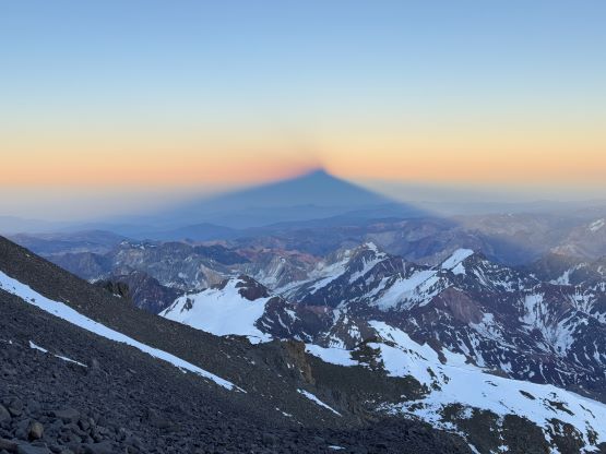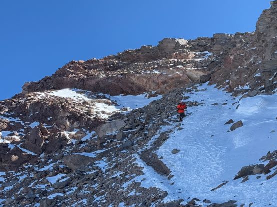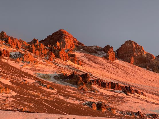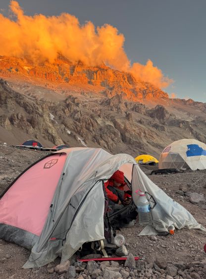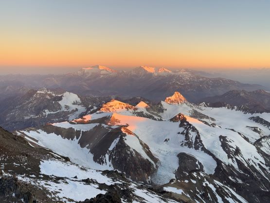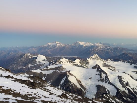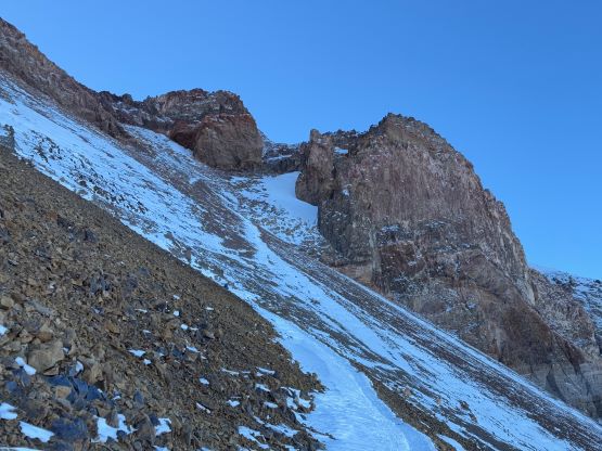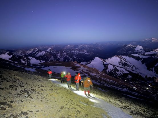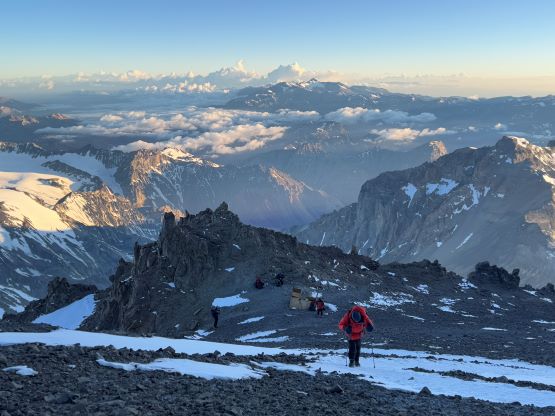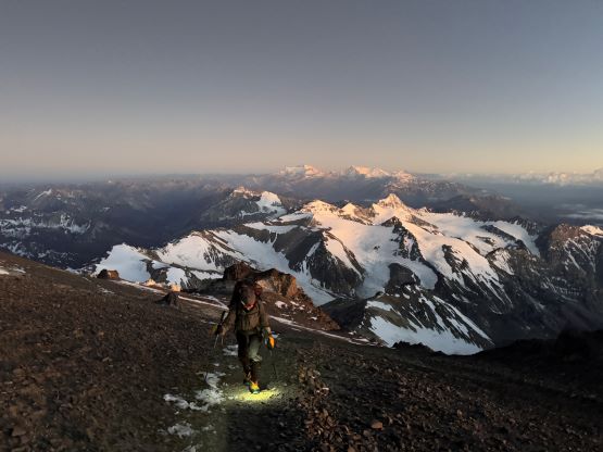 Most people would spend an additional 2 days acclimatizing to C3 (Berlin or Cólera) at just under 6000 m elevation but fit parties usually skipped that camp. I was recommended strongly by both Oakley and Petter to skip C3 and I agreed with them, so our summit push would be Day 5 from C2 (Nido de Condores). We got up at 3 am and managed to start going an hour later. I had told Erica that the 6000m boots would be used for solely one day and I was correct. In hindsight we should have hauled the trail runners to C3 as the descent from C3 down to C2 later in the day would be much nicer in the runners. The boots were only needed above C3. That soloist had started at least half an hour earlier so in the pitch dark we quickly had to find our own way. Thankfully I had Rob’s GPX guiding the way, even though we didn’t take the exact same path. The route-finding was needed but not complicated. About an hour later we made to Camp Berlin and then quickly traversed to Camp Cólera. In retrospect it’s possible to go directly to Cólera skipping Berlin, as we discovered on the descent. A streak of headlamps showed up above Cólera which was to my expectation. Apparently quite a lot of climbers were gang ho at this timing window. We did our first short break at Camp Cólera donning some wind protection (for Erica) and then resumed. The game quickly became how many climbers could we pass. The daybreak came at Piedras Blancas and it was also here that we had passed most of the guided groups. By the time we reached the slope above Independencia we had passed most except for the few fast climbers higher up.