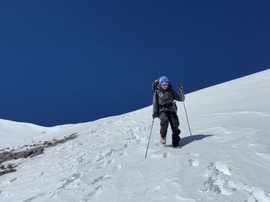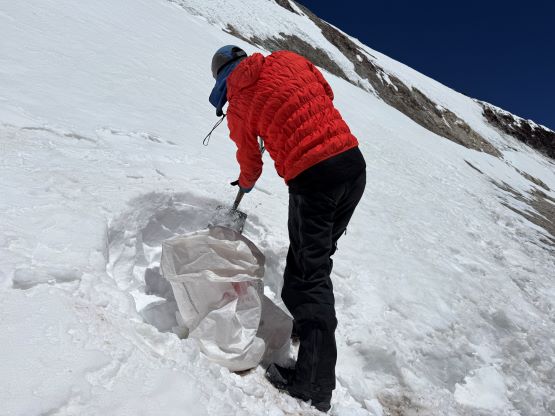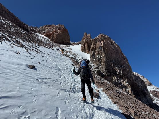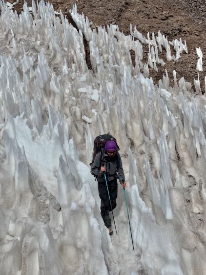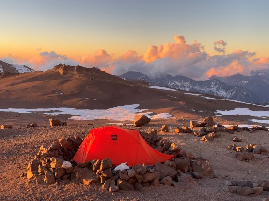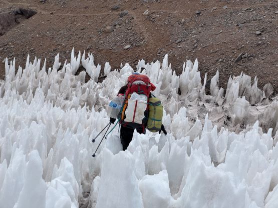 The amount of water consumption at this altitude was far greater than I thought, that by the morning we were down to only 2.5 L and 1 L of which was needed for cooking breakfast. We also drank an additional liter of water so we only had 0.5 L left, which was not enough for us to ascend to C2. Both of us tried to get more water from INKA’s dome tent but this time, to no avail. I then made the decision to quickly pack things up and melt snow as soon as we encountered the first major patch of penitentes which turned out to be about halfway between the camps. There were a few smaller patches earlier on, but I wasn’t satisfied with the colour of them. I then quickly realized that cooking without the vestibule in the winds at this altitude was next to impossible but there’s thankfully a boulder to provide some shelter, that the ignition was marginally possible. By the way my own lighters could not work even at the base camp’s altitude so from Cerro El Plata onward we had been using my sparkler, but here at Aconcagua’s basecamp they were selling the “high altitude lighters” for 5 dollars each. I bought two for us, and they worked all the way up to 5600 m at C2 without issue. These were just the normal Bic lighters whereas mines were the torch styled, so those planning Aconcagua take note of that. Excluding the time melting snow we got to C2 in under 2 hours. We pitched our tent in the INKA’s area which is the uppermost just under 5600 m elevation. The pitching was difficult in the winds and necessitated two people’s team work. We then spent the next half an hour walking around searching for that rumoured tarn, which never ended up exist. In some years one could collect water from that but not in this season. It was completely iced up that even with an ice axe it was not possible to access liquid water. Our neighbours were one couple from Vancouver trying the 360 route, and another soloist in his own Samaya 2.0 tent with vestibule (same as ours). I could tell from this soloist’s tent that he must be fast, as this tent costs 1600 dollars so to afford that he better knew what he’s doing. They told us that the only solution was to melt snow, and thankfully we pitched our tent not far from the snowfield. INKA had provided two massive ass shovels and I kindly borrowed one potato bag from the guides. The next few hours were then spent collecting and melting snow. We got more than 8 L of water and the 450-gram canister was still having residuals. This was also Erica’s first time melting snow so I made her doing more work for the experience.