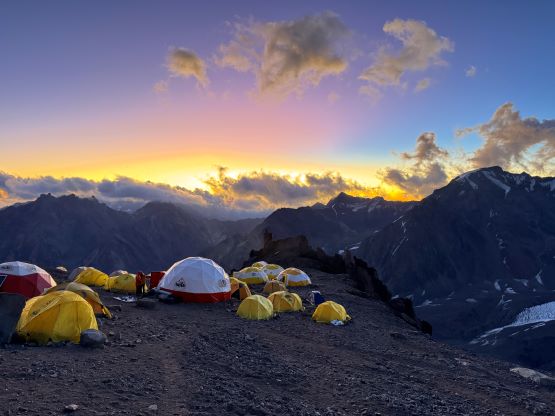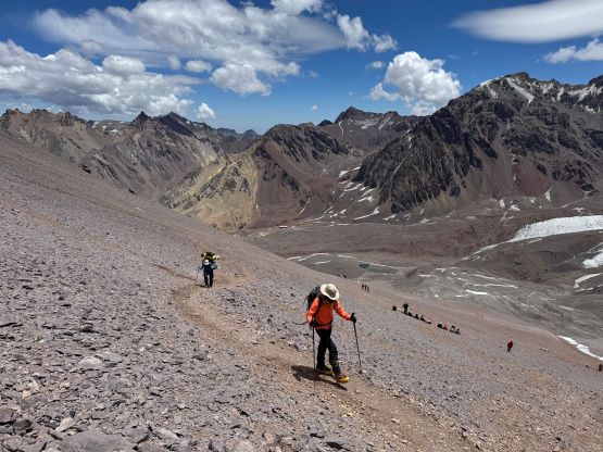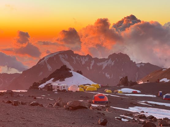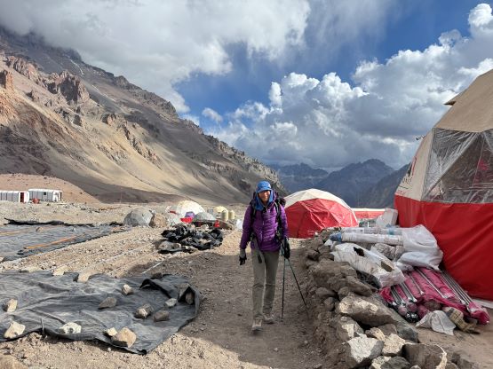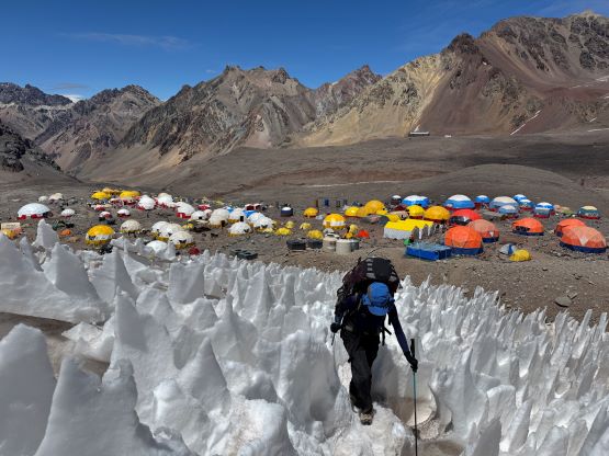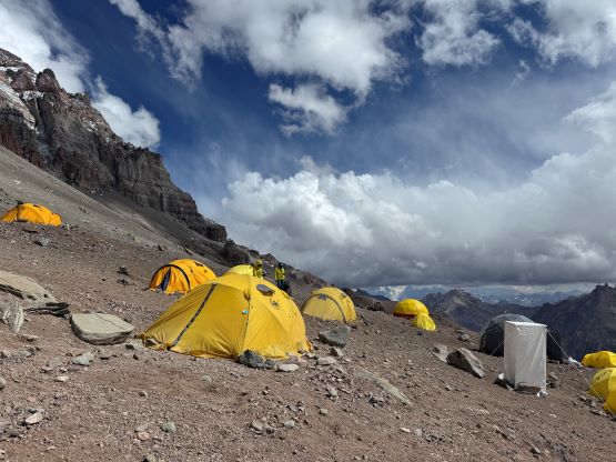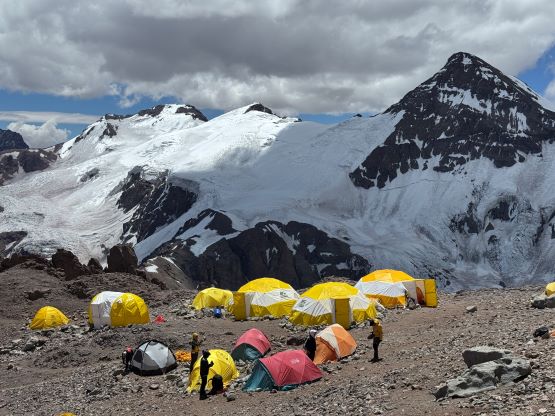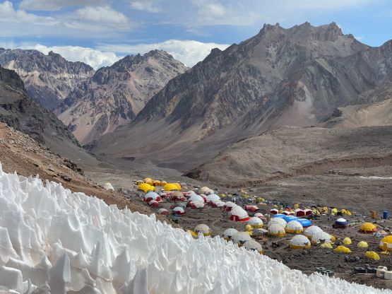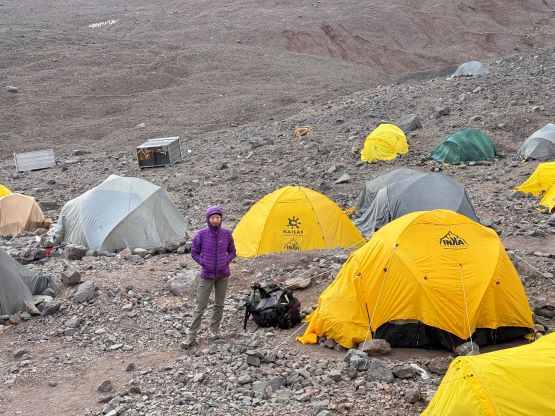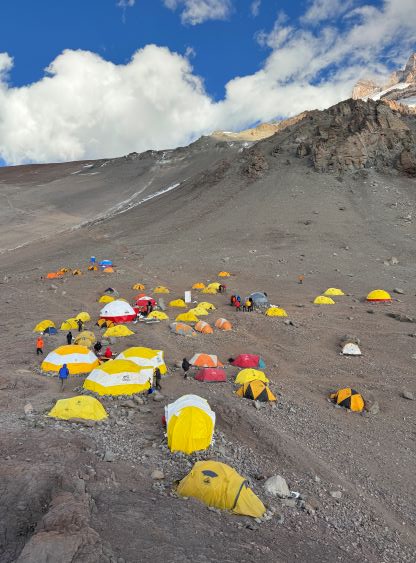 Most parties would spend another night at their high camp whether it’s C2 or C3, but that made no sense for us. For various reasons we should descend all the way to the base camp on this same day, but since we were doing great on time we should take our time resting at C2. The extra package of dinner and the ramens (brought for contingency) had now become the luxury, that we cooked everything we could to regather some physical and mental strength. That 6L water jug had also become quite useful. The water we collected yesterday did not freeze, and served us well on this day, that melting snow was no longer needed. About an hour or two later we finally got out and got our things packed. The weather was turning but the winds weren’t too strong, but it had become overcast with some isolated flurries. The descent from C2 to the base camp was still quite cold, but at least it was fast. I led us descending most of the “scree route” but made lots of stops for Erica’s feet to recover. The toes and the blisters were becoming serious but again, there’s nothing we could do. I thought about to call for the helicopter to make use of that 400 USD Erica had spent, but this isn’t Mt. Everest, that the blisters wouldn’t be serious enough to initiate a rescue, so suck it up and that’s it. I didn’t think we descended that much faster than the ascent, but still got down to the base camp in time for a leisure dinner, after reclaiming our bags. I kindly asked if we could spend another night or two in INKA’s tents but this time we would have to pay, so we still had to dig everything out to pitch our own tent. At this point we had decided to spend 45 dollars to purchase 4G of WiFi, and the first thing I did was to log Aconcagua on Peakbagger. Right away I noticed that two others had logged it on the same day and sure enough, one of them had sent me an email asking it was me descending the Canaleta. I remembered nothing from that section as I was dead focused on going down, but sure enough I replied that let’s meet up on the following day. The two Washingtonians would spend another night at C3.