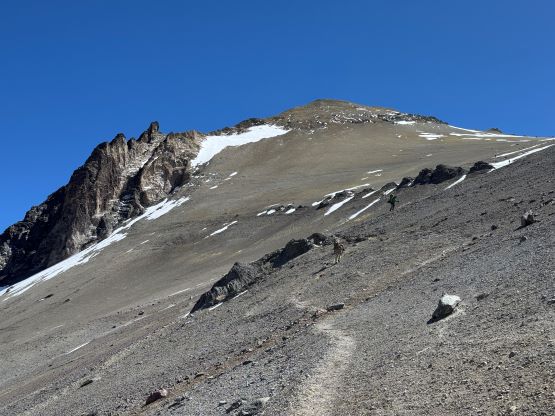 Besides taking some obligatory victory shots I did not linger any longer than 3 minutes up on the summit. My stomach was bowing and my arms had started to tingle so I was quite concerned. I told Erica that if she needed any further transition then I would not wait. I would descend as quickly as I could, at all costs and Erica agreed. The donning of sunscreen was sort of mandatory so that stop could not be saved. I did not remember much for the next while, but the next thing I stopped at the cave area waiting for Erica to catch up. I had felt considerably better through descending 200 m so it’s better to do the rest of the descent together. I later learnt that Erica’s arms were also tingling even from the day before, so that proved the theory that doing Cerro El Plata itself was not sufficient to fully acclimatize for Aconcagua, but we were overall fit enough to pull it off rather quickly. The virgin snow beside the highway of tracks on that traverse provided a soft platform to plunge down, that by no time we were down to the shoulder above Independencia, removing our crampons. We took a lengthy break there as we both were feeling fine by now, and did the rest of the descent down to Camp Colera rather leisurely. This was Erica’s first time wearing the 6000 m boots and the boots were giving her toes massive troubles. I started to regret not hauling the trail runners up high but there’s nothing we could do beside taking our time and sucking it up. The descent from Camp Colera down to Nido de Condores was brutal on Erica’s feet so we really took our time, but still got back by lunch time.