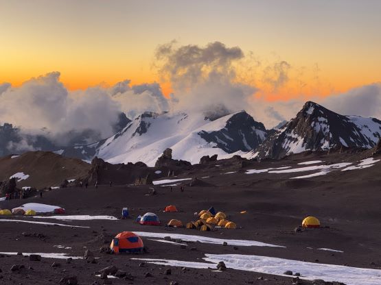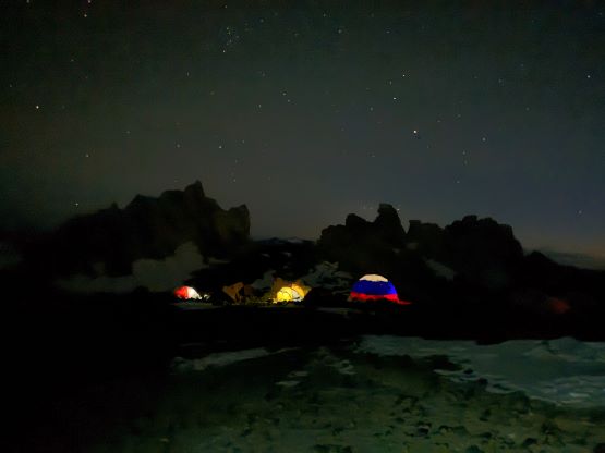 The third day started bright and sunny but the summit was capped with some lenticular clouds. This was supposed to be the windiest day and it sure looked that way. I walked Erica back to the medical tent and they still gave us green light to continue, but Erica was only feeling 60-70%. I was thinking to wait for another day and Jan. 3rd was also looking promisingly as a summit day, but the weather forecast changed. The only window was now on the 2nd so we either started now, or wait for the next window. I was packing as if I had to solo it, but after I finished packing Erica said that she would like to give it a shot. Another hour later at about 1 pm we were able to start. Meanwhile I consulted with Raphael and Sofia that we would like to hire a porter for 20 kg weight but the reply was negative. It was impossible to have porter at such last minute. I was 50/50 about the result because the porter was very expensive here. The 20 kg for 2.5 hours of plodding to C1 would cost 195 USD. I told Erica that I would suck it up and be our own porter. By this point we had learnt from various sources that there’s no water (not even snow) at C1 so we together loaded up 7 L of water. I carried 4.75 L of of that, in addition to our tent and Erica’s sleeping bag. I did not weight my pack but it was probably in the range of 50-60 lb. The going started hard but I quickly caught the rhythm. There were also tens of climbers ahead and we slowly passed most of them. The only persons plodding faster than us were the porters and even they were only marginally faster. About 50 m under C1 we had caught up and passed the INKA’s commercial team and this granted us a nice tent spot. I’m very familiar with these popular peaks, that to obtain the nicest tent spots (or to claim the best pre-set tent) one would have to be their first. The INKA’s guides were also very generous and offered us two additional liters of water for free, and this, combined with the 7 L that we hauled us saved us from making a lengthy trip to gather snow, or being seriously dehydrated. The evening was gorgeous at this camp and we walked around for photos and socialized with other climbers from the same company. The winds were surprisingly calm here at 5050 m.