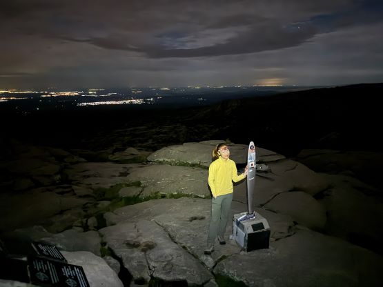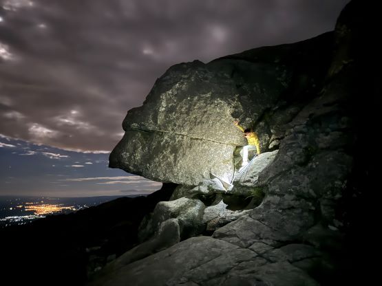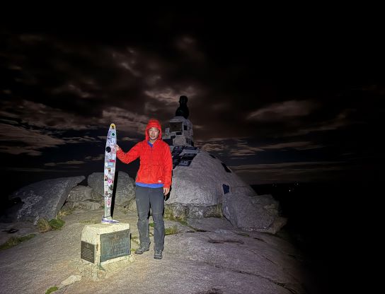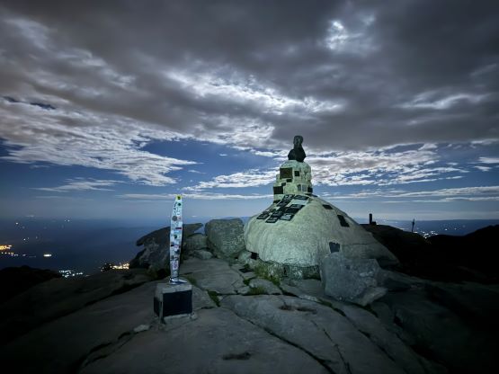 Since we indeed managed to drive to the very top (of the false/south summit) and the weather was mostly clear, there’s no point in rushing. We were both very hungry from the pushing so we spent about 40 minutes cooking the couscous with the Indian curries that we had brought in from Canada. We used up the last two pouches of the curries here. The winds made the cooking difficult so I just simply cooked inside the car. We then started the 1-km walk to the true summit with head-lamps on. The hiking portion of this ascent was more difficult than I thought with some route-finding and scrambling. Right off the bat we did not manage to find the correct way, and faced a few steps of 3rd class down-climbing. We then joined the trail and followed it, with some up-and-downs to the west side of the summit block, which we scrambled up through a 3rd class chimney. I was sure there existed an easier alternative but it was fun to scramble and I was getting impatient in finding the “correct” way. This brought us to the true summit with the statue but we could see at least 1 or 2 contenders further to the north so those must have been checked as well. Later reading Rob’s trip report we realized that the statue was indeed the highest point, but it was always a good practice to be 120% sure. Unfortunately seconds after summitting that northern contender we got barked by a pack of wild dogs which was quite scary. We quickly retreated to the summit with the statue and took a much needed break.