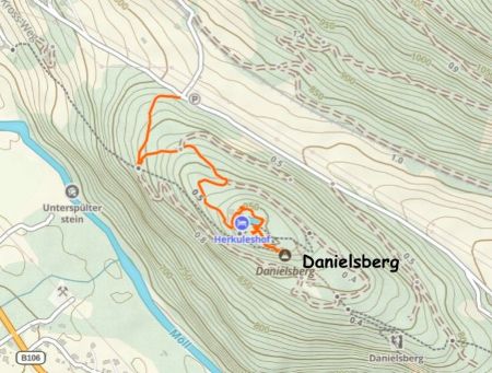 The obvious way to drive up Danielsberg was from the NW so we headed that way. The road was apparently under some construction that it was currently unpaved, but there was no gate nor any prohibitive sign, so we drove the rental 2WD to the uppermost parking area. This area seemed private to us and the last switchback or two had “no driving” kind of sign, but we plainly ignored that and parked and the uppermost lot nevertheless to conserve energy.