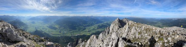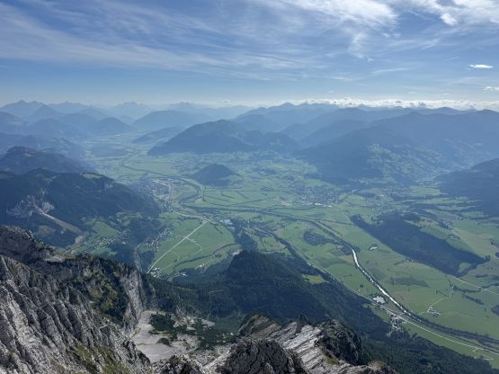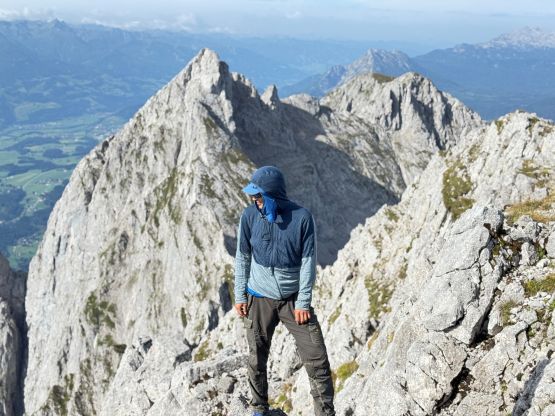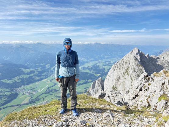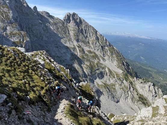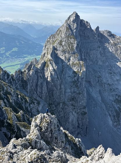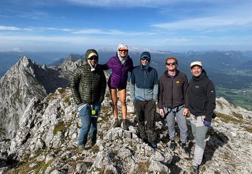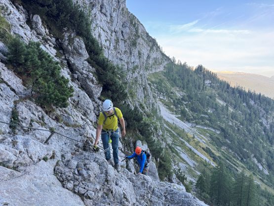 Grimming is a large monolith of sandstone in northern Austria and boasts over 1500 m prominence even though it’s far from being a lofty peak by the Alps standard. The standard route is an easy via ferrata ascent. Experienced scramblers would not need to bring a harness as the route is at most Grade B, but this is a long and committing route with fair amount of route-finding and exposure. For the past few weeks Adam and I had been connecting with James Barlow and Arjan van Denzen and the plan was eventually made to meet up for at least Grimming. We had a few days of overlap but the weather was only “bomber” for the first day, and we would use this day for the hardest of the few proposed objectives. Grimming is not as physically demanding as Großer Priel but is technically more challenging.