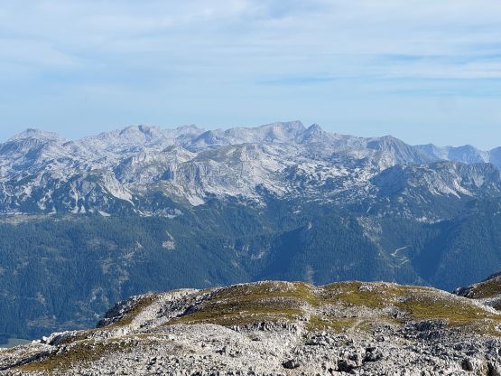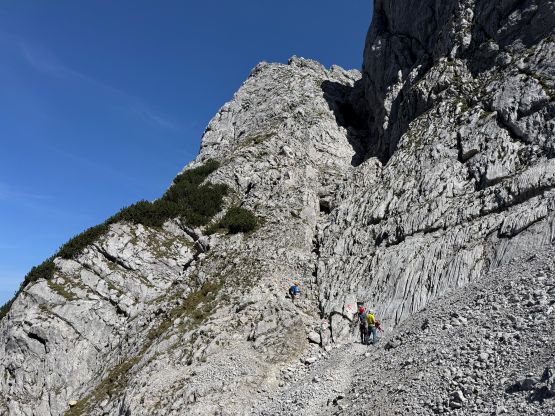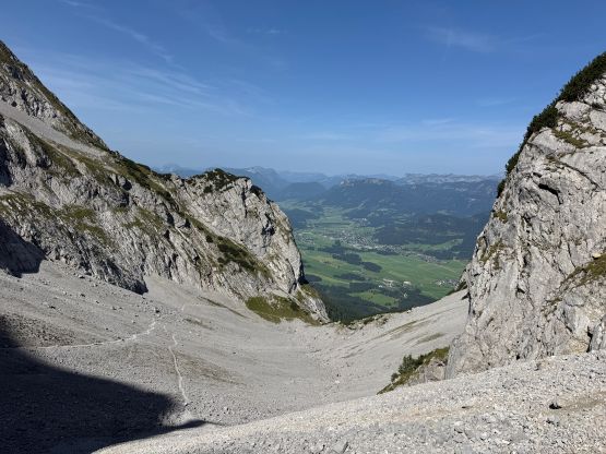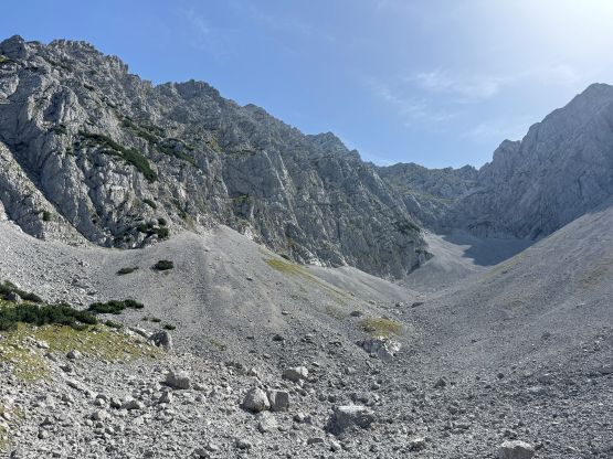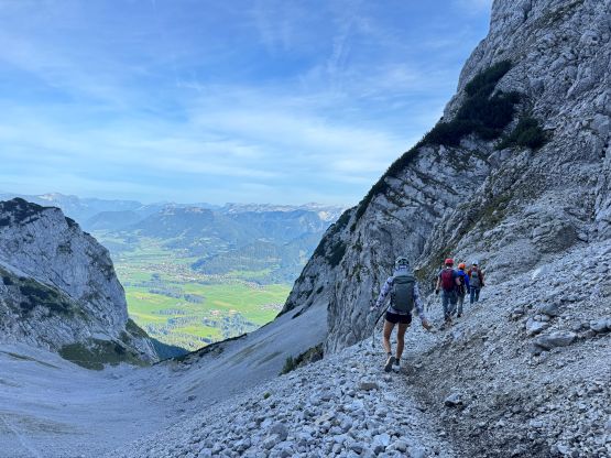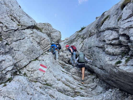 James had been recovering from a near-death accident so we wouldn’t be plodding at a blistering pace, and that was fine. Adam volunteered to go ahead and the pace he set was much slower than the day before on Hochkönig. In the previous day I thought Adam simply could not walk at a slower pace but apparently that was not true. Erica and I did not bother to bring our harnesses but the rest of the group decided to do the climb “properly” by actually using the via ferrata kits. Erica and I mostly stayed behind but we did scramble ahead a few times. The scrambling was at most “class 3” if using the artificial holds and chains. At one point we ascended into an amphitheatre feature and this marked the start of the upper route. The immediate next while would be plodding up a scree trail.