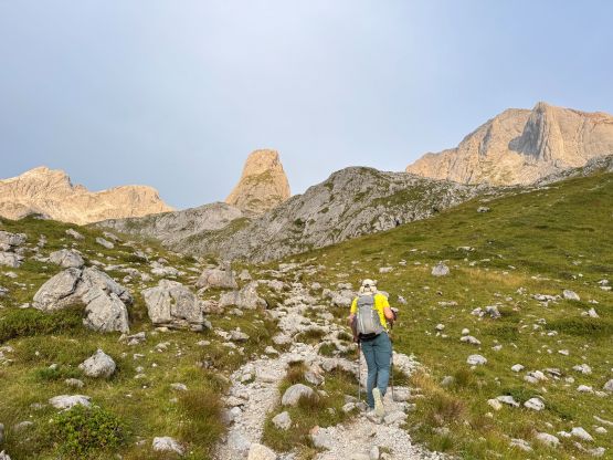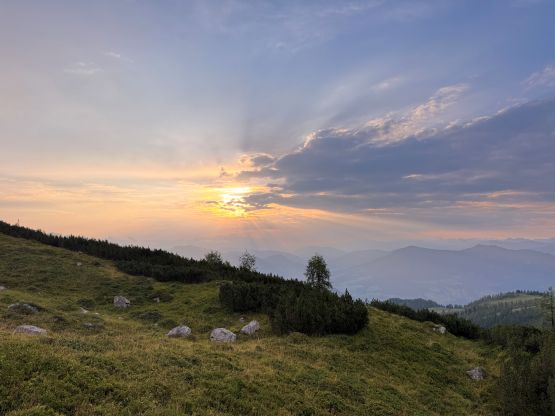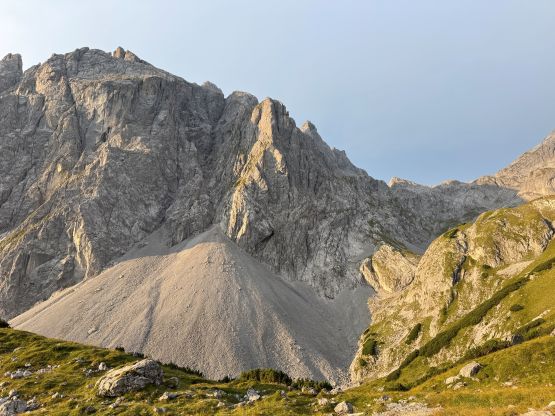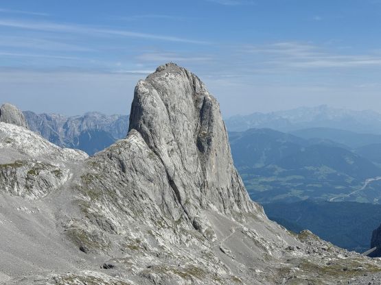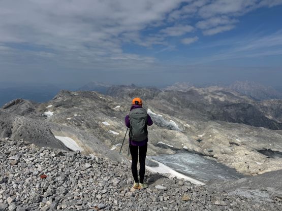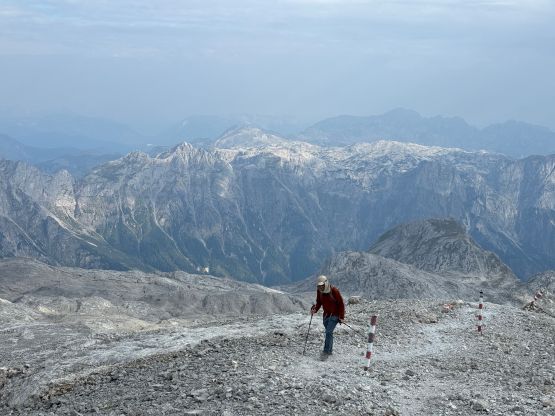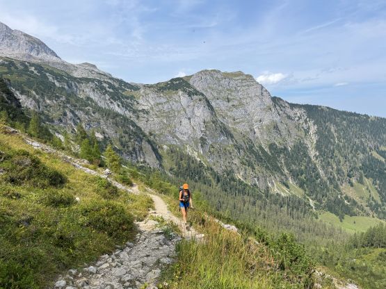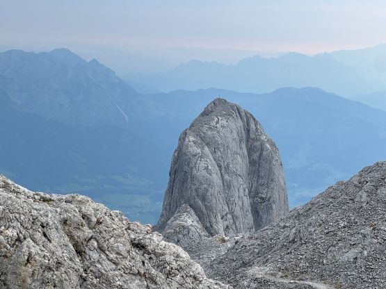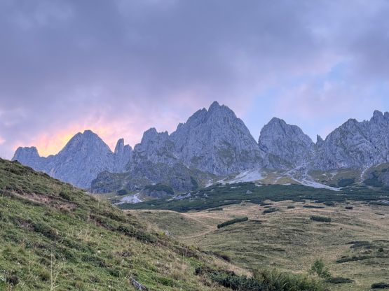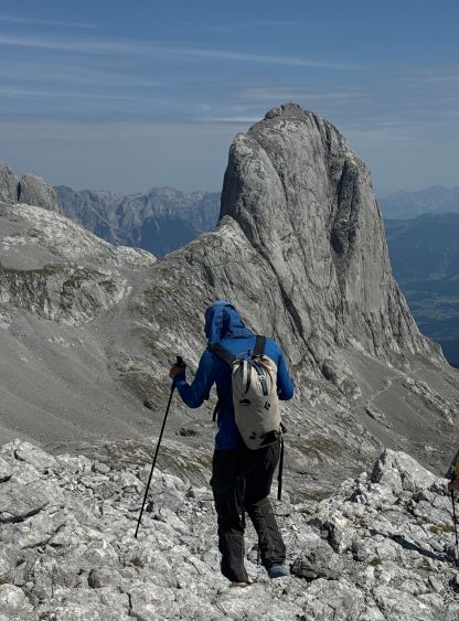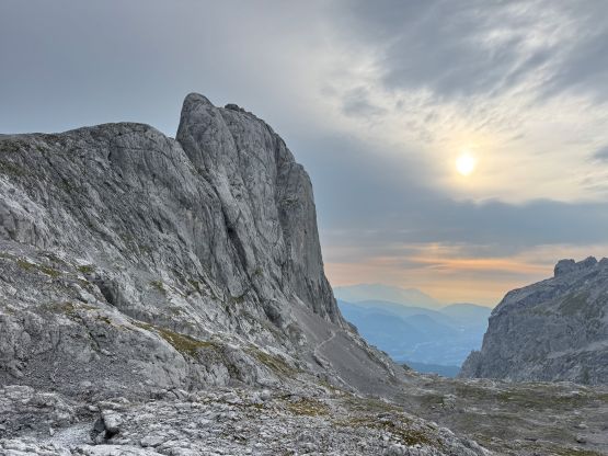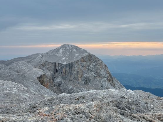 Due to the concern of afternoon thunderstorms we opted to get up at around sunrise and start plodding at around 7 am. There were fair amount of hikers arriving and starting before us so we more or less had to wake up before the alarms actually went off. This was a long route with about 20 km distance with over half of them in the alpine terrain. There’s a trail on the Gaia map and this trail is indeed used regularly but this is mostly a “marked route” with lots of micro-terrain and rock hopping. We still did it in a timely manner but the work load exceeded my expectation. In any case Adam opted for a head start and he was still pushing the pace quite hard, so it took Erica and I at least half an hour to catch him up and I was maxing out my uphill pace. By this point we had entered the main valley heading towards a distant tower called Torsäule. To my surprise this imposing tower is non-technical and we debated for a few hours whether or not we should tag it on the return. It unfortunately would add 250 m extra elevation gain, so sanity won in the end. Hochkönig was long enough of an outing such that we would not be doing bonus peaks on this day.