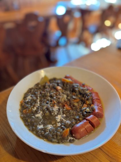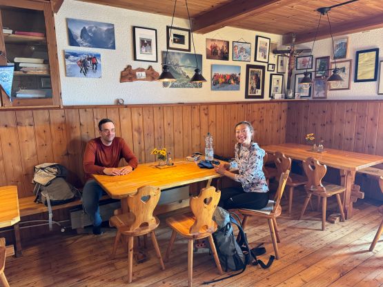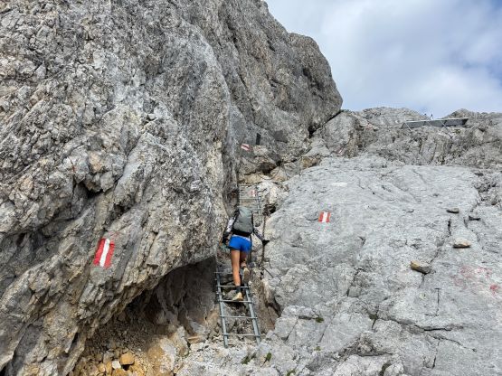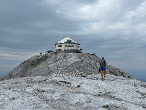 The route traversed underneath the south wall of Torsäule and by this point we were officially in the alpine. The route was still well marked with the ref/white pained flags but we started to encounter micro sections of up-and-downs and scrambling. The micro-terrain was especially annoying on the stretch traversing across the north slopes of Großer Bratschenkopf. We did at least an extra 100 m elevation gain due to those descents and some of the descents were even equipped with ladders, chains and pitons so the terrain was not that easy after all. The weather was also not looking too promisingly with dark clouds to the north, but I caught some cell receptions and checked the weather updates. The forecast was still calling for “mostly sunny” and there’s a fancy hut/restaurant on the summit, so we wouldn’t worry much. With perseverance we made our way to the ladder climbing underneath the summit hut, and got to the top in less than 4 hours. We weren’t planning to spend a lot of time in the hut but the comfort and the warmth was too hard to pass. We eventually stayed for almost 2 hours in the restaurant taking in the European experience. The food was surprisingly not ridiculously pricey so we all ordered something.