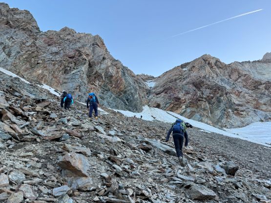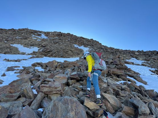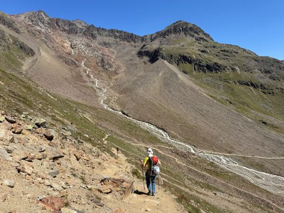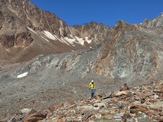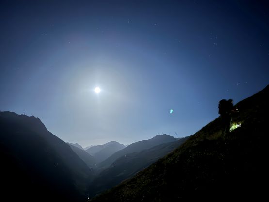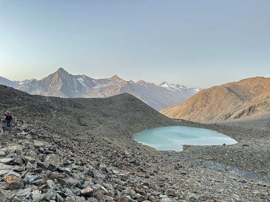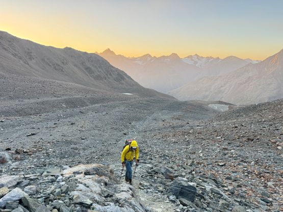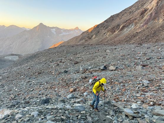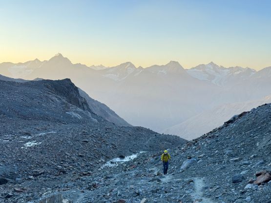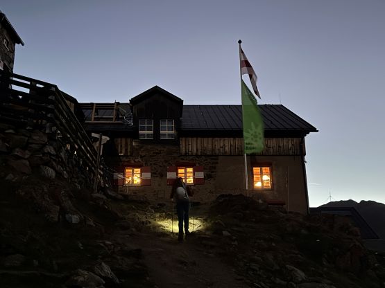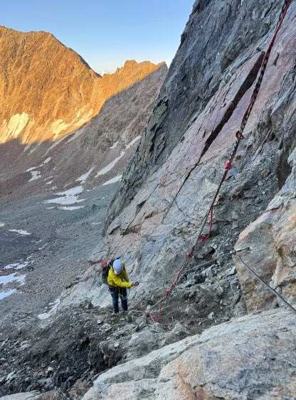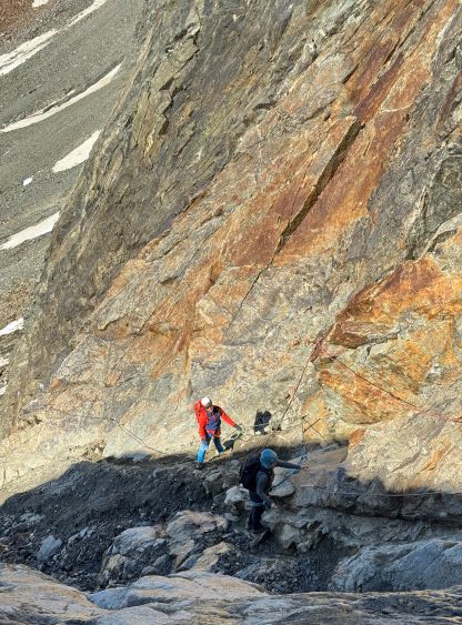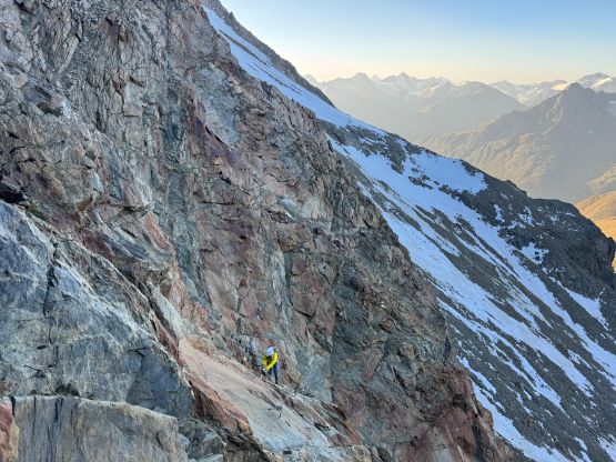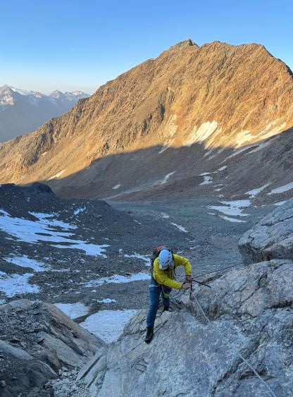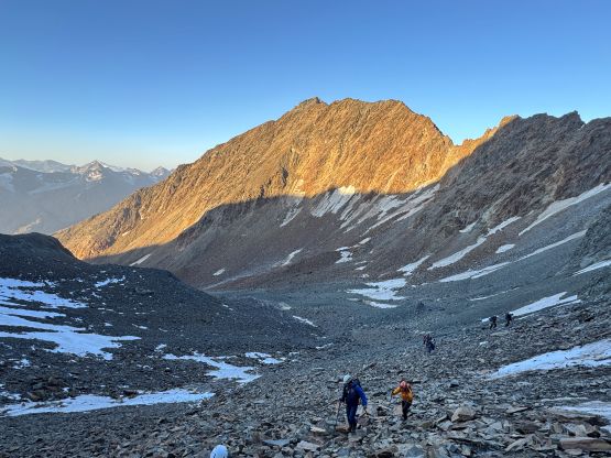 The start of the trail was a bit overgrown but the quality quickly improved. We made steady work up the endless switchbacks under the full moon, and were eventually joined by some other day-trippers coming up from the longer, more standard way. It was still dark when we got to the hut and a lot of the climbers in the hut hadn’t even started their ascent. The trail beyond the hut deteriorated quickly into some boulder fields that even with a GPX track we still lost the trail several times. The horizon was finally bright enough to not need to use the head-lamps anymore so we simply plodded through the boulder fields and picked up the trail again on the far side. Meanwhile we passed a soloist who was also “lost” in the boulders. There’s one sizeable creek crossing so we took a break there loading up the water bottles and then resumed the grunt into the upper valley heading towards the via ferrata climbing. The people on this mountain were all reasonably fast that we weren’t much faster overall. The area under Mitterkarjoch was actually a rock-covered glacier so the footings were very loose, but we were able to stay on a reasonably defined path for the entire way.