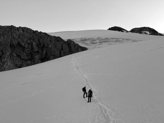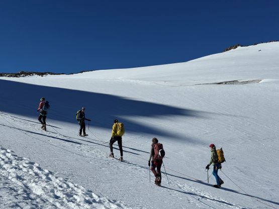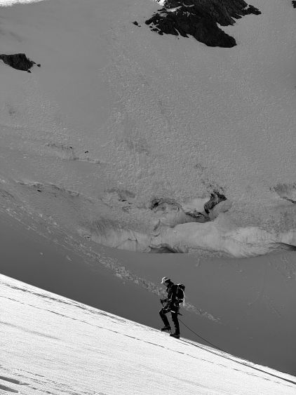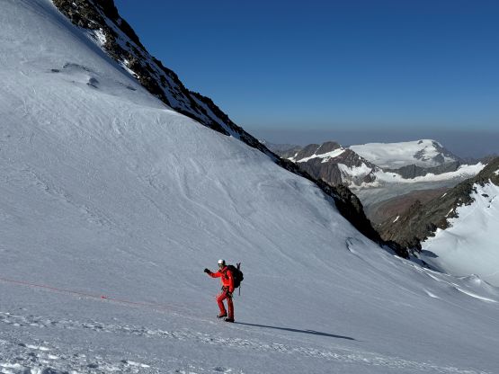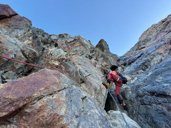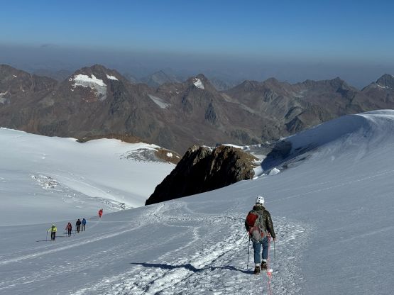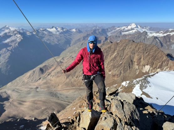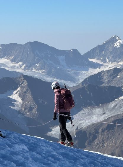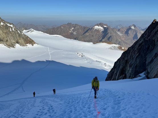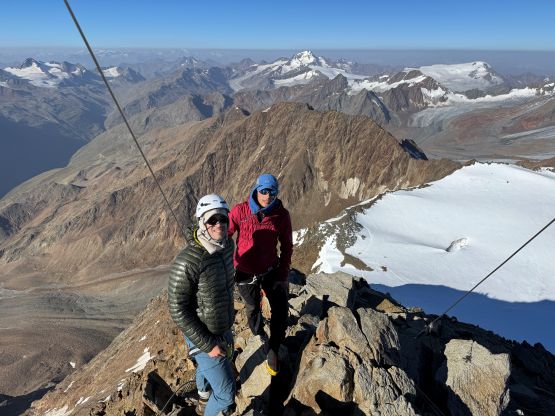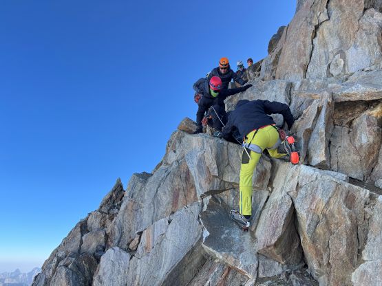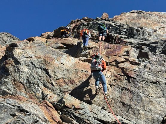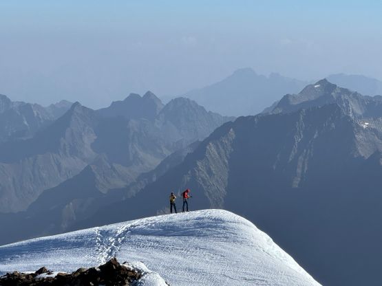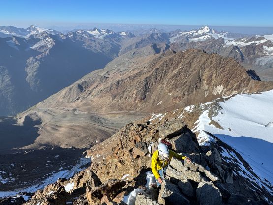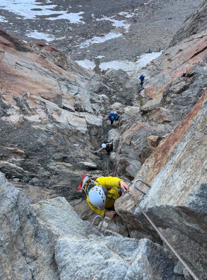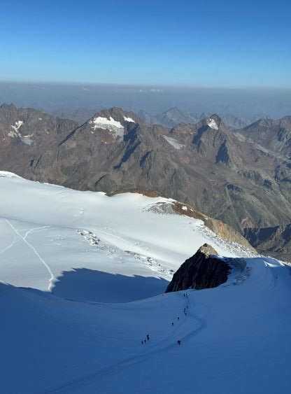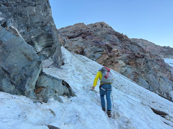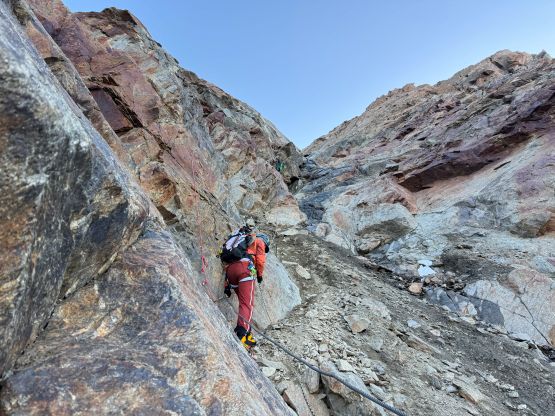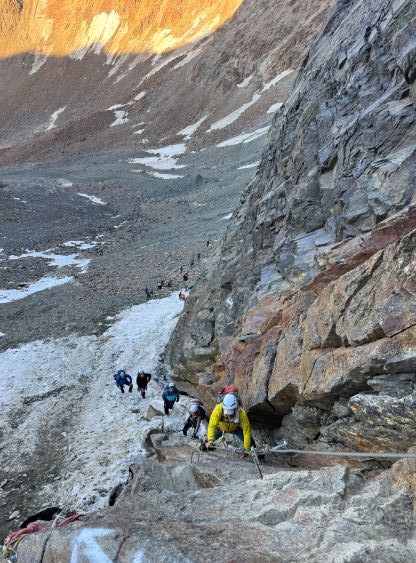 I was anticipating the ferrata to be “easy” but it didn’t appear to be that way, so I ditched the trail runners and donned the mountaineering boots. Right off the bat we had to ascend a snow slope and the slope angle was about 35-40 degrees. I did so without ice axe nor crampons and was fine. Higher up we merged onto the ferrata with mostly “Grade B” climbing but one spot was particularly tough with some busted footholds. The result was several vertical-to-overhanging pull-up moves with considerable amount of exposure. We all rappelled that pitch on the descent a few hours later. The upper section of the ferrata wasn’t difficult but was very exposed. We caught up to a group-of-two on the edge of the glacier and one of them was actually from Alberta, Canada but was currently living and working in Munich, Germany. Adam and I were quicker on the transitions so we started the crossing of the glacier. We still had 300 m elevation gain left. Contrary to my expectation, there was a decent overnight freeze that the condition was actually perfect. We simply followed the “highway” of tracks to the SW Ridge and then ditched the rope and crampons there. There wasn’t any notable crossing of crevasses. The final scramble up the SW Ridge was mostly dry with a few 3rd class moves near the top, and we were one of the earliest summitters of that day.