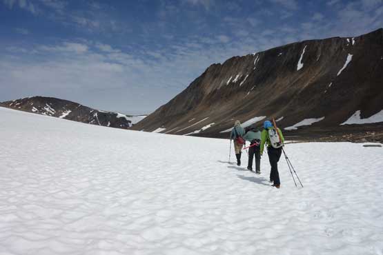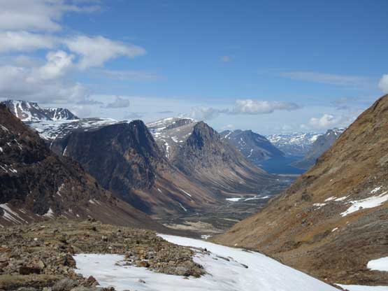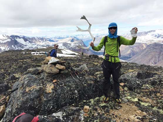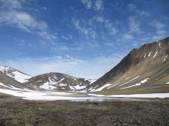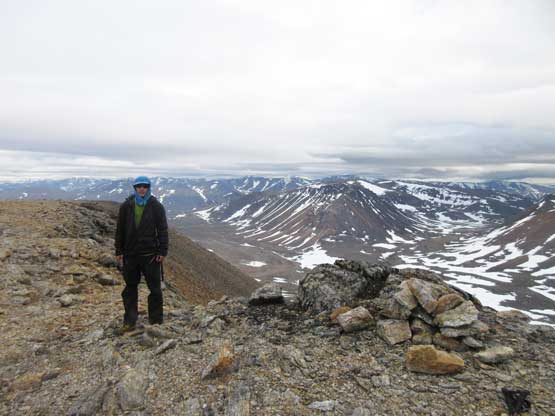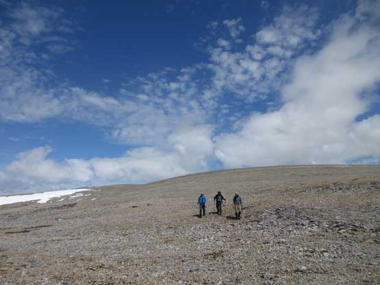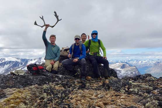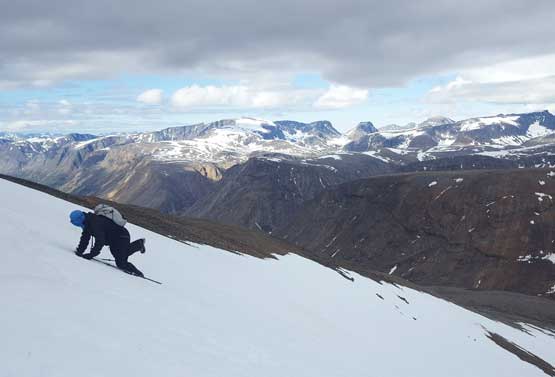 After a quick break filling up the water bottles we started the last section of this ascent – about 800 m vertical gain to the summit of Mt. Barnes-Pauze on mostly unstable talus and scree. The lower half was straightforward. Eric led us into a broad bowl and then scrambled out of the bowl on some easy 3rd class terrain. The worst came at gaining the summit ridge from the top of this middle bowl. The talus was steep and loose making rockfall a real issue. The four of us picked two slightly different lines and after what seemed like a long while we topped out of the summit ridge. The summit was only 100 vertical meters above us and presented no further challenge. On the summit we found the register booklet placed by Greg Slayden et al. in 2004. There was no other entry so we could have claimed a second recorded ascent at least on the internet. However, later in the trip we found that the park’s ranger, Randel had also made the summit and found the register. I’m sure it’s been climbed by others, probably the inuits as well.
