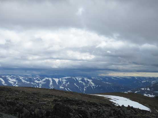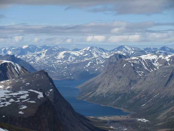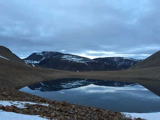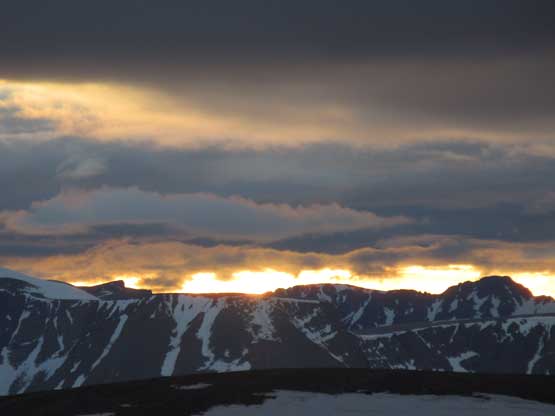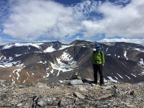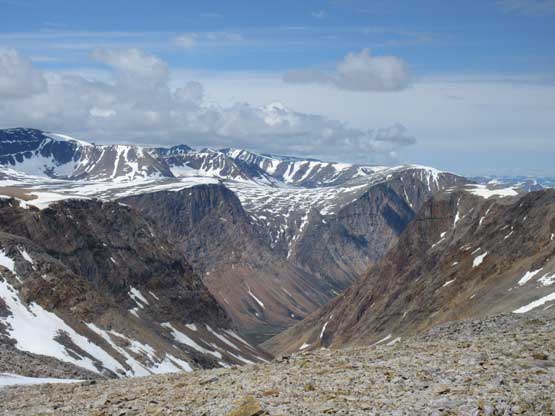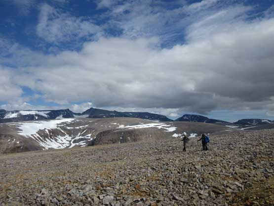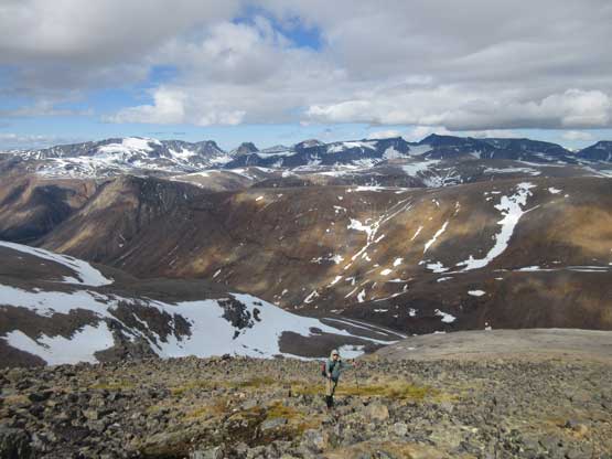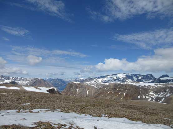An ascent of Mt. Barnes-Pauze from Mt. Caubvick’s basecamp involves at least 25 km of round trip distance with around 2000 m cumulative elevation gain, on talus, scree and snow. Despite the lack of technical challenge this would be a very physically demanding day with considerable amount of navigation challenge. Our plan was to take the most direct westwards line over several smaller, unnamed summits but such approach involved a dip of over 500 vertical meters before Mt. Barnes-Pauze. Thank to the extremely long daylight time we didn’t start until well past 9 am. Our first objective was plodding several kilometers up the main valley due NW from our basecamp. Once a long strip of snow appeared we took the advantage, gaining over 600 vertical meters to the first (unnamed) summit of the day. This might sound easy on paper, but was a real tedious process, especially when wearing mountaineering boots.