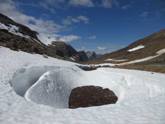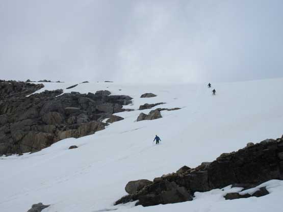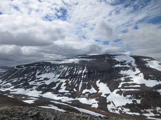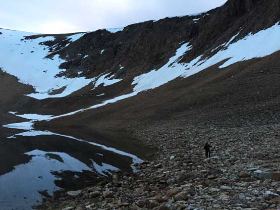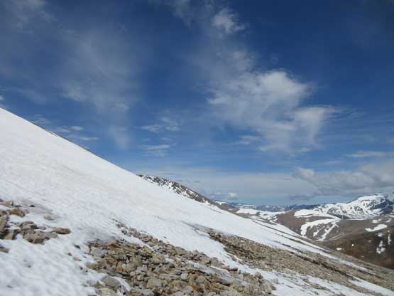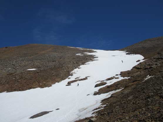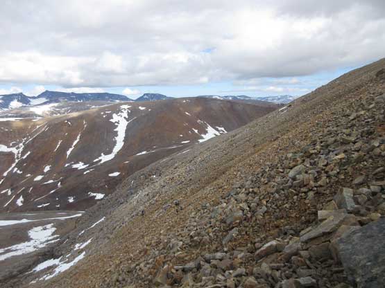 From the first summit we continued along the long, broad ridge/plateau for several more kilometers due SW and then W, to just below the highest of the three unnamed summits. From there I led the way traversing/descending easy talus slopes to a large snow gully. Plodding down this gully involved a lot of post-holing but was still much faster than hopping on talus. Then there came a short ascent onto a small ridge before descending another 200 vertical meters into the broad valley separating Mt. Barnes-Pauze with the group of unnamed summits. This last bits of descent did not look easy at first but I managed to find a scramble route on chossy 3rd class terrain to get us down.