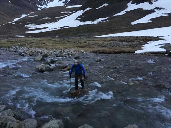 Due the length of this ascent we didn’t linger any longer than necessary on the summit. On the descent I led a previously-scouted route in hope to stay mostly on snow. There came some very tiring post-holing sometimes down to waist deep near the rocks, but overall I still thought the snow was more efficient. The post-holing became better and we even got to boot-ski some sections. The 500 m re-ascent out of the deep valley just to the east of Mt. Barnes-Pauze wasn’t as fun but we all kept our heads positive and eventually it would be over. Near the top of the grunt Eric and I decided to tag that unnamed bump while Patrick and Yeuhi opted to bypass. We eventually caught up to them along the long, tedious traverse across the plateau. Near the end of the traverse we somehow convinced ourselves to ascent up and over a 3rd unnamed bumps instead of retracing our ascent route. The descent off this unnamed summit involved a long stretch of steep snow up to 40-45 degrees and a creek fording near the end. I didn’t even bother to take the boots off because I was already soaked anyway. We eventually stumbled back to camp at 11:30 pm just about the time to need headlamps, and that concluded this long, but productive day.
