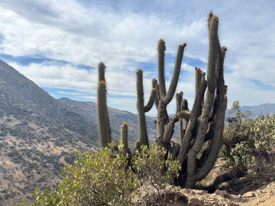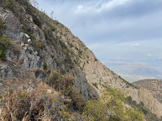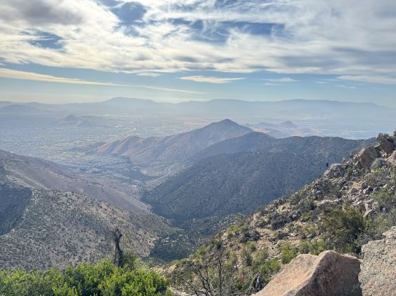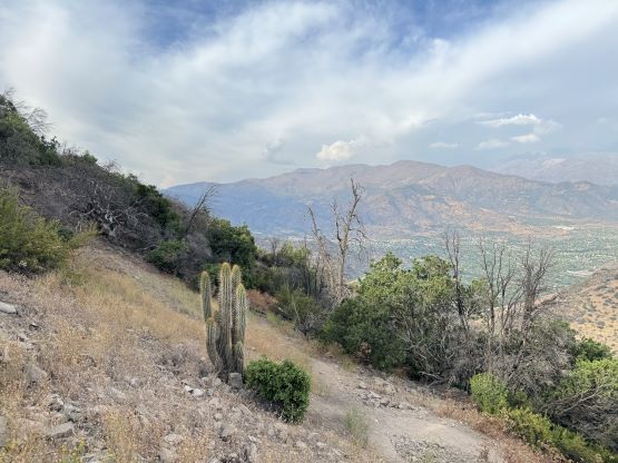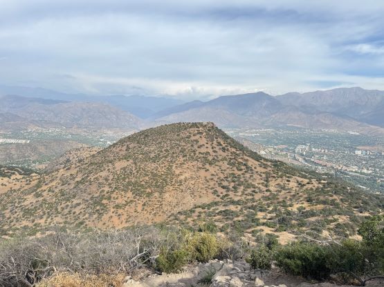 I quickly jogged back down to the saddle, paying extreme attention to the pebbles-on-dirt rail. These trails are not for the beginners by any measure. I then faced than grueling 400 m grunt up the SE Ridge to the summit of Cerro Manquehue and I was feeling quite tired. I was able to thankfully catch a rhythm and eventually made the summit without having to stop for a single break, but the pace wasn’t very fast. The trail was also not that straightforward neither with numerous steep and scrambly sections, and it was a bit awkward having to scramble while holding a water bottle in my hand. I had decided to carry absolutely nothing more than 1 L of water in this outing so I did not have a backpack. I managed to catch some sporadic cell reception from the summit, logged both peaks on Peakbagger app and then informed Erica about my progress. They had apparently moved location but it was still in the nearby area.
