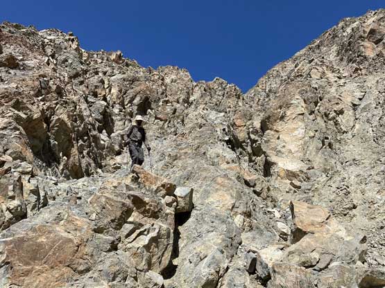 We opted to carry only one backpack to save weight as all we needed was some food and water. Given the fact we just spent one month climbing at high altitude we wanted to do some experiment to see the improvement of our cardio capability. Connor led a blistering pace as usual and I would try as hard as I humanly could to keep up the pace. Half an hour later we entered a narrow and steep section in the canyon and the route transitioned into a series of fun, class 2 scrambling steps. The fun stretch lasted for a while but tapered off as we transitioned onto the upper mountain. We got onto a plateau feature and the summit was still over 400 m taller.