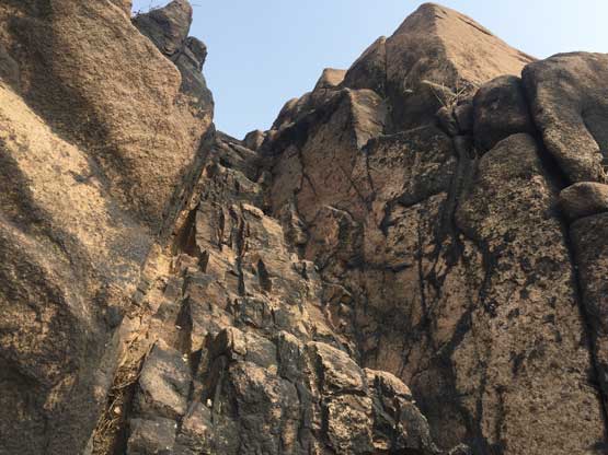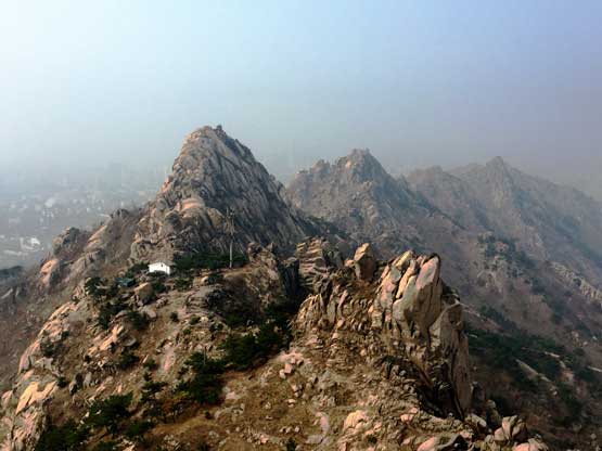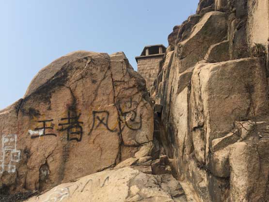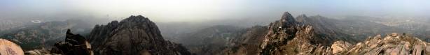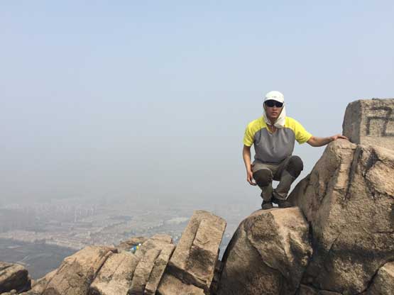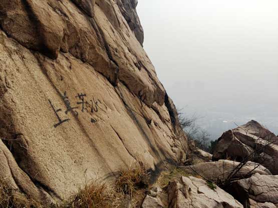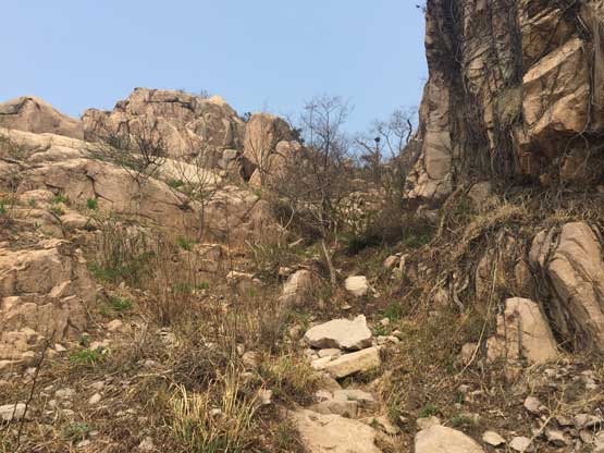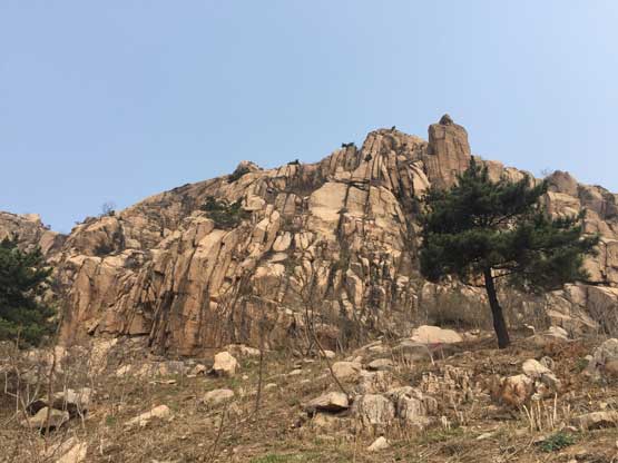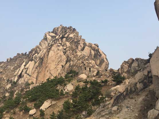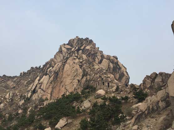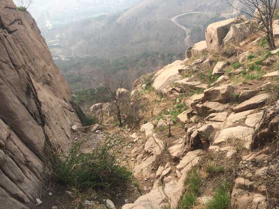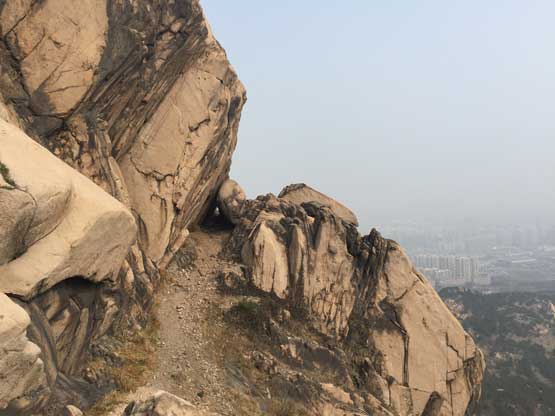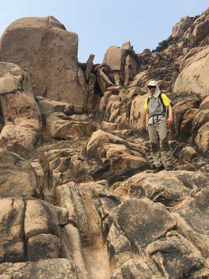 The ascent of the east ridge of true (second) peak involves lots of Class 2 and sometimes Class 3 scrambling on granite. I really liked the wilderness feeling of this little peak. Unlike the previous two peaks I did in China this one has no concrete staircase nor hordes of tourists. I only met two other hikers on the mountain and that tells something.. The summit offers some view of Qingdao city but the dense industrial smog obscured any distant view.