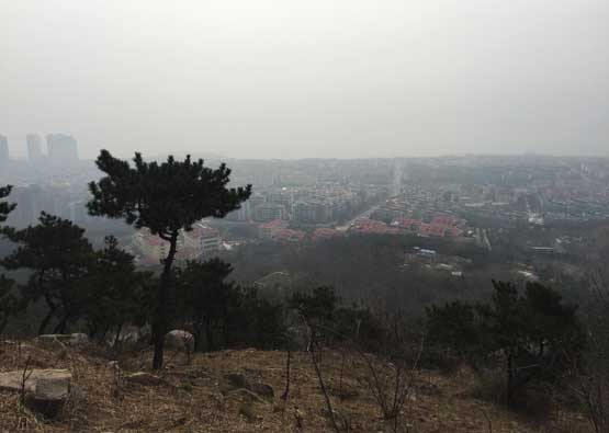 Fu Shan is the tallest peak within the city limit of Qingdao on the east coastline of China. The whole mountain locates within a national forest so despite the close proximity to a large urban area, much of the hill is still relatively “wild”. The highest peak (among 8 or 9) is the second peak from east end. I spent at least a couple hours researching the routes but couldn’t find a lot of detailed, useful information but I did get a rough idea. From my hotel near the railway station I had to take a bus ride (501) to Hai’an Rd. and this whole process took about an hour.